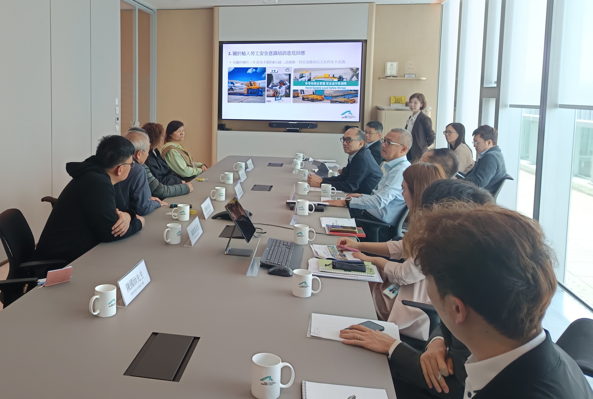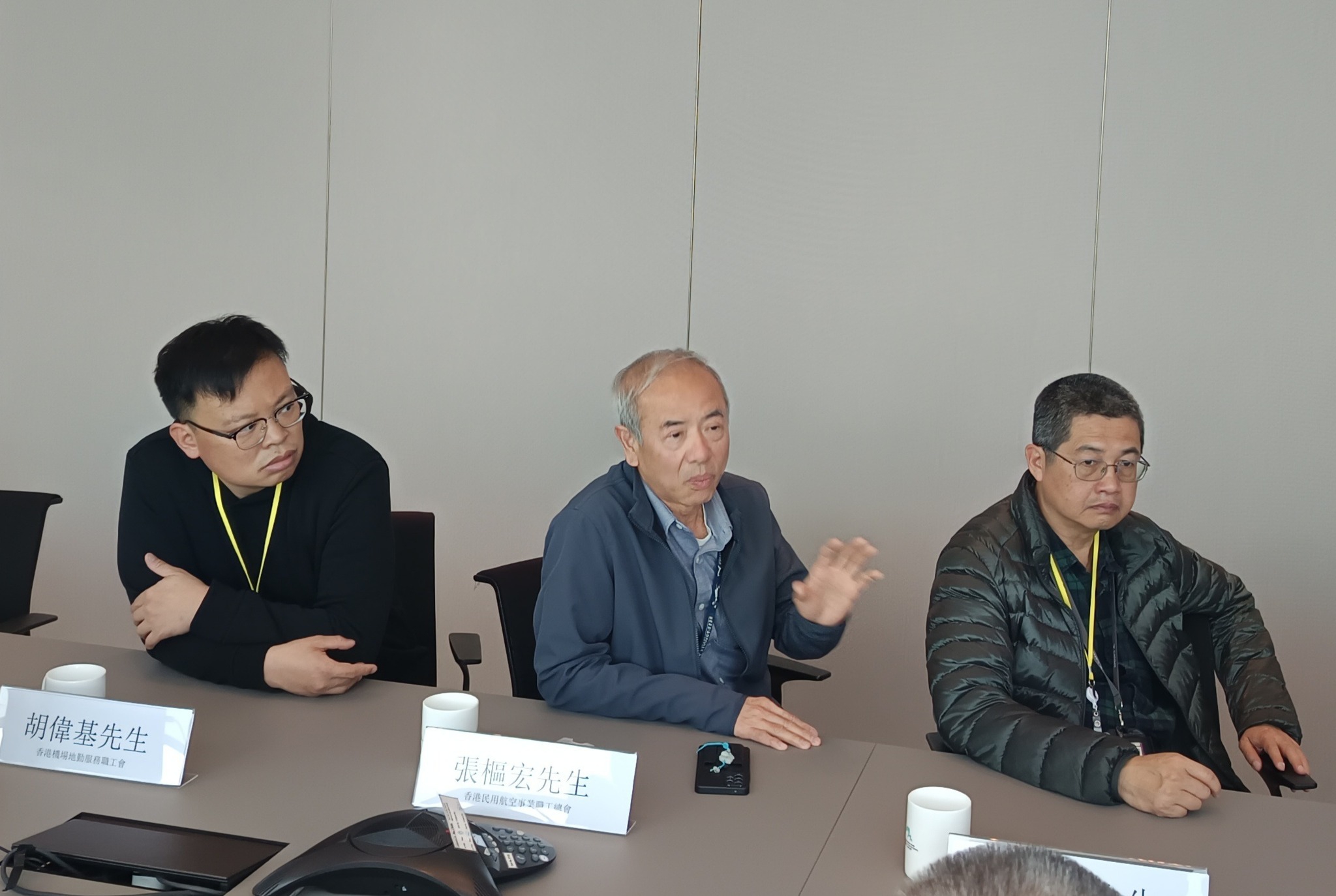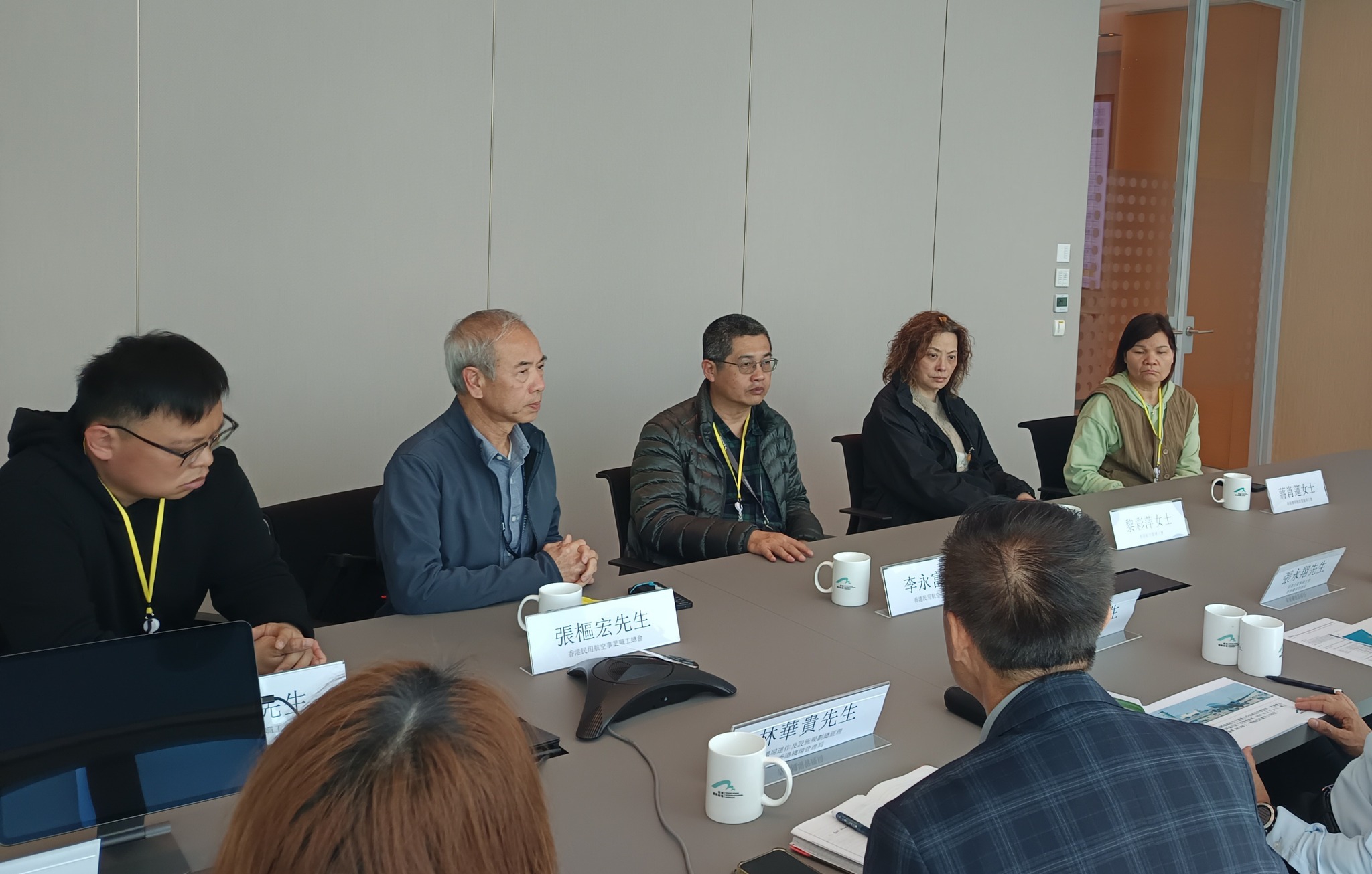 香港民用航空事业职工总会主席李永富、名誉会长张枢宏、香港航空业总工会主席黎彩萍、香港机场地勤服务职工会副主席胡伟基、及香港机场餐饮业僱员工会理事蒋肖莲,与机场管理局的管理层会面。