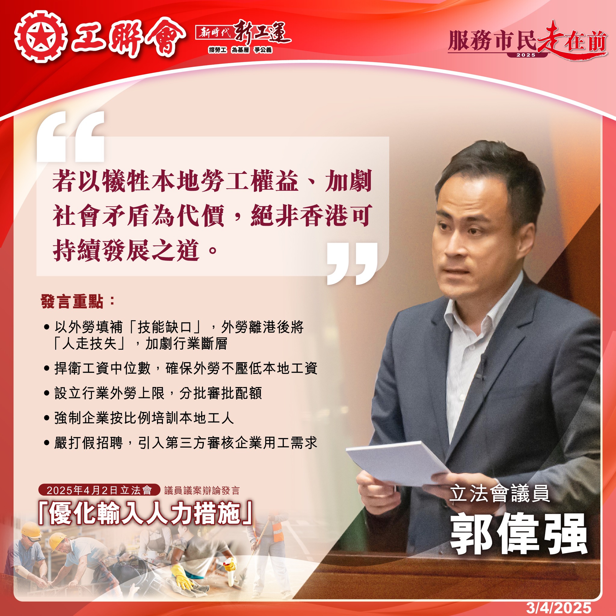 工联会立法会议员郭伟强在立法会会议上发言重点: 以外劳填补「技能缺口」,外劳离港后将「人走技失」,加剧行业断层; 捍卫工资中位数,确保外劳不压低本地工资; 设立行业外劳上限,分批审批配额; 强制企业按比例培训本地工人; 严打假招聘,引入第三方审核企业用工需求。
