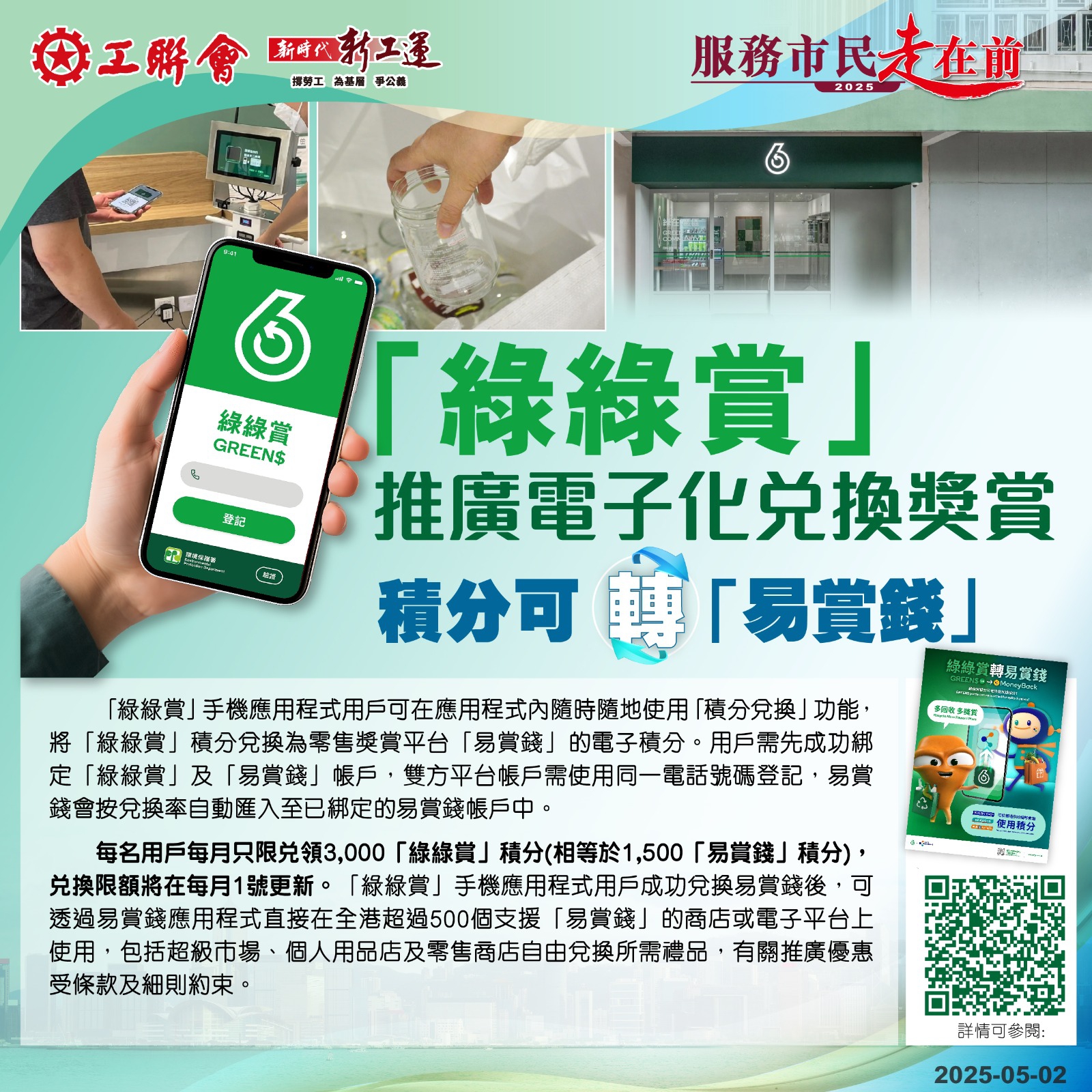 每名用户每月只限兑领3,000「绿绿赏」积分 (相等于1,500「易赏钱」积分),兑换限额将在每月1号更新。「绿绿赏」手机应用程式用户成功兑换易赏钱后,可透过易赏钱应用程式直接在全港超过500个支援「易赏钱」的商店或电子平台上使用,包括超级市场、个人用品店及零售商店自由兑换所需礼品,有关推广优惠受条款及细则约束。