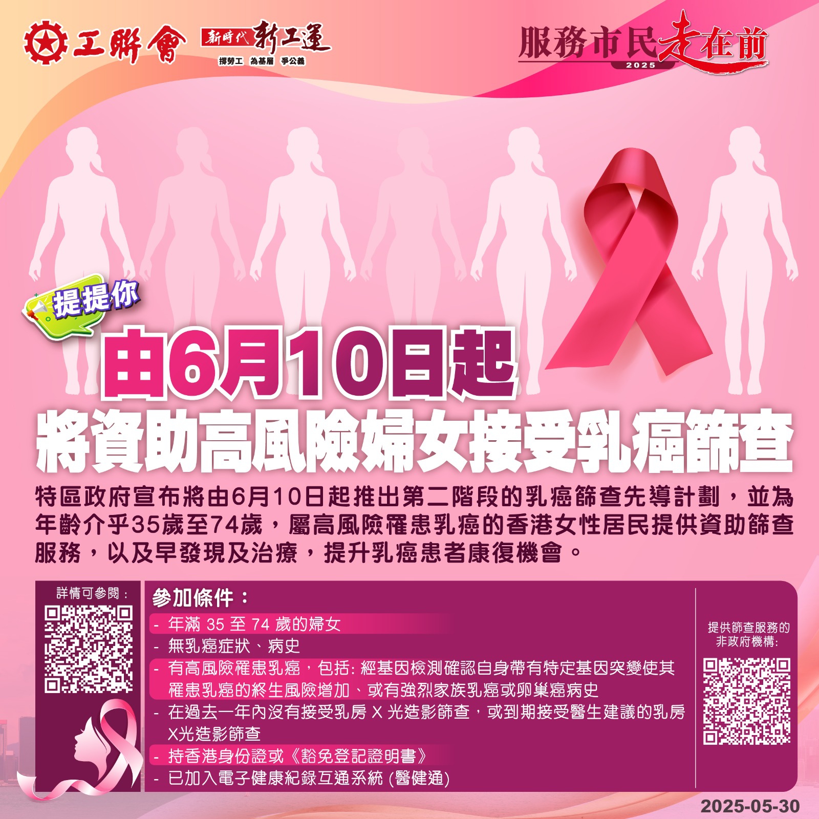 2025-05-30 工联会提提你︰由6月10日起将资助高风险妇女接受乳癌筛查