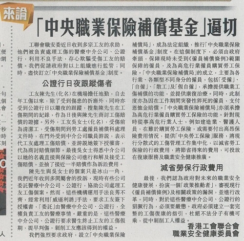 工联会职安委近日收到多宗工友的求助,他们被负责处理工伤的医疗中介公司、公证行,利用不良手法,存心欺骗受伤工友的赔偿。我们促请政府对以上组织进行监管;同时,尽快订立「中央职业保险补偿基金」制度。
