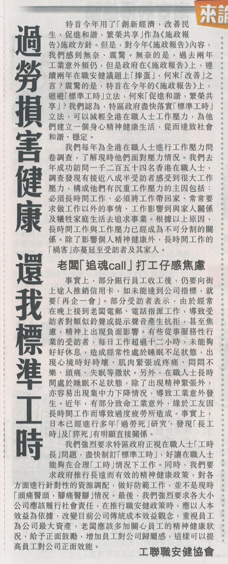 作为《施政报告》施政方针。但是,对今年《施 政报告》内容,我们感到无奈、震惊。无奈的是,过去两年工业意外频仍,但是政府在《施政报告》上,连续两年 在职安健议题上「捧蛋」,何来「改善」之言?震惊的是,特首在今年的《施政报告》上,迴避「标準工时」立法 ,何来「促进和谐,繁荣共享」?我们认为,特区政府尽快落实「标準工时」立法,可以减轻全港在职人士工作压 力,为他们建立一个身心精神健康生活,从而达致社会和谐、稳定。