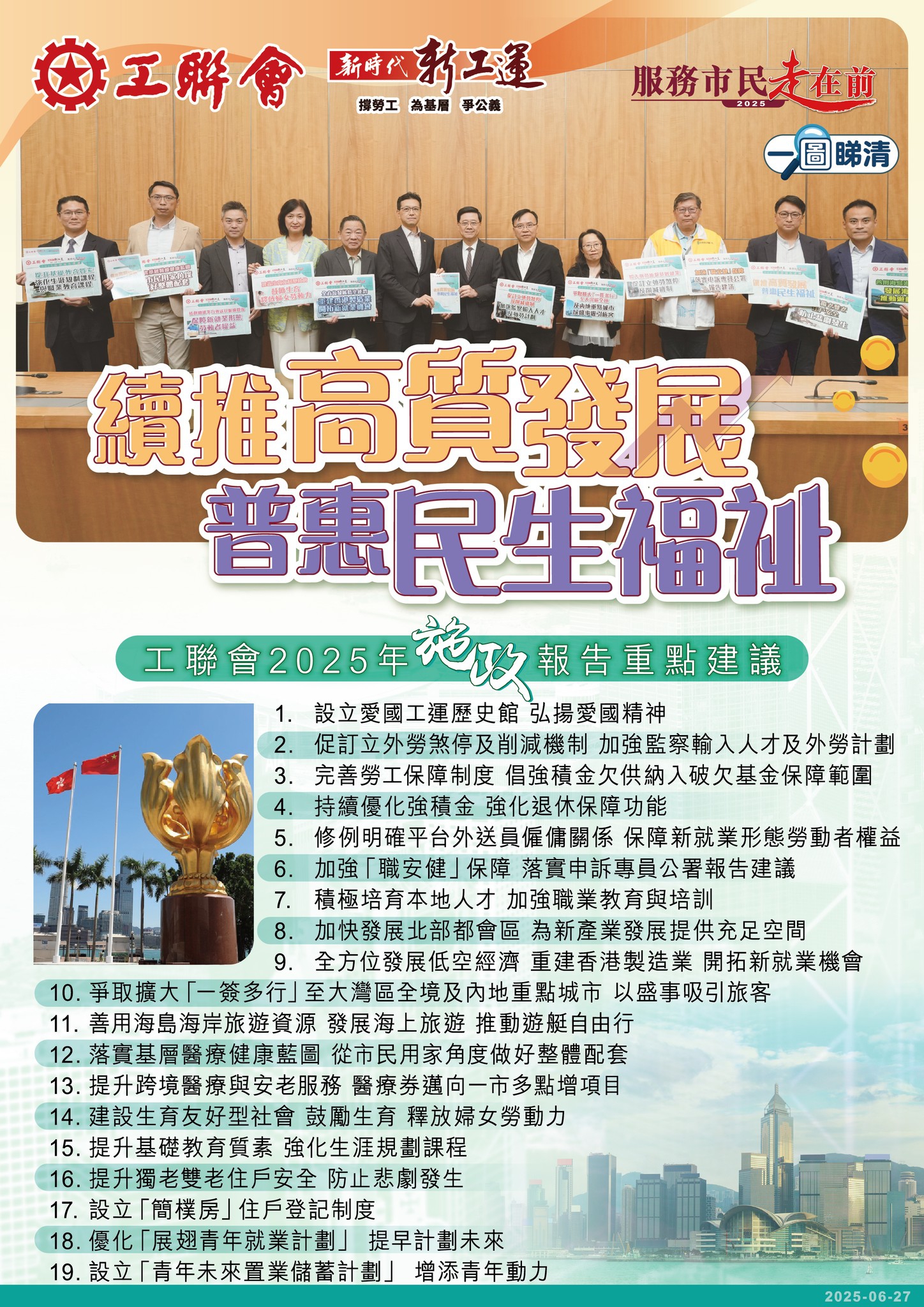 行政长官正就新一份《施政报告》进行谘询,工联会代表今日(6月27日)与行政长官李家超会晤,就《施政报告》提出:续推高质发展 普惠民生福祉的意见。出席者有:工联会会长、立法会议员吴秋北,工联会理事长、立法会议员黄国,工联会副会长、职业训练及促进就业委员会主任陈邓源,工联会副会长兼秘书长马光如,工联会副会长、妇女事务委员会主任程岸丽,工联会副理事长、权益委员会主任丘燿诚,工联会副理事长、立法会议员邓家彪,工联会副理事长、香港建造业总工会理事长周思杰,工联会立法会议员陆颂雄、郭伟强、梁子颖。 香港进入由治及兴新阶段,特区政府全力「拼经济、谋发展、惠民生」,2025年第一季实质本地生产总值按年增加3.1%,展现经济较强韧性。然而,香港仍然面对不少挑战,港人北上消费成风,本地消费疲弱,工务工程量不足,失业率升至3.5%,饮食业、建造业失业率分別增至5.7%及6.3%;以上情况须要特区政府重视并带领社会各界积极解决。 工联会建议书以「续推高质发展 普惠民生福祉」为题,围绕国家意识、劳工、经济发展、社会民生、大湾区城市互联互通、青年发展等六大范畴向行政长官提出19项重点,总共72项建议。重点包括:深化爱国主义教育,弘扬爱国工运歷史与精神;积极应对行业失业率上升问题,订立外劳煞停及削减机制;优化强积金制度,加强僱员保障;完善新就业形态保障,明确平台外送员僱佣关系;提升建造业「职安健」,遏止严重工业意外发生;加快发展北部都会区,支持发展新质生产力,重建香港制造业;持续发展「无处不旅游」及「蓝色旅游」;建设生育友好型社会;以及持续优化医疗、安老、基层住屋、青年发展等民生政策。 建议进一步强化课堂教学的爱国主义作用,让爱国主义教育融入不同科目的教材编写和课堂内容之中。此外,建议政府积极支持抢救香港工运歷史,进行工运史料整理;设立爱国工运歷史馆介绍香港爱国工运事件,包括:海员大罢工、省港大罢工、两航起义、护产斗争等。 建议全面检讨「补充劳工优化计划」,对失业情况严重、工资收入受压的行业和工种,冻结并逐步削减输入外劳名额,设立煞停机制。同时,要全面加强监察输入人才及外劳计划,强化劳顾会监督及把关功能;制订输入劳工监察机制,定期公开外劳及企业资料。 强积金僱主供款是法定责任,亦是僱员收入的一部分;建议将强积金僱主供款部分纳入破欠保障,加强对僱员的退休保障。 建议设立保证回报的强积金计划,为追求稳定回报的打工仔提供多一个选择。此外,亦建议政府按机制调整强积金供款的上下限;并尽快落实为低收入的僱员及自僱人士代供安排。 建议政府尽快参考国家最高人民法院案例,明确依「用工事实」认定僱佣关系,避免企业因平台工身份模煳而规避提供僱佣权益的责任。建议设立「爱心驿站」为平台外送员提供饮用水、休息、充电等暖心服务。 申诉专员公署早前发布《政府对建造业职业安全及健康的监管主动调查行动报告》,提出一系列包括加强监管和执法的建议,促请政府相关部门全面落实建议并严格执行,遏止严重工业意外多发频发。 建议设立跨部门委员会,统筹规划职专教育发展,结合僱员再培训局(ERB)改革,提升课程规划的实务导向性。及早推动职专教育在校园普及,帮助学生建立「职学双轨制」认知,强化教师职专教育的培训。此外,建议由政府带头参考资歷架构(QF)等级为考虑入职或晋升条件,增加社会对QF的认受性。 建议政府应贯彻产业主导,从业界需要出发,主动拆墙松绑,探讨灵活创新的土地开发与使用方式,例如精简行政流程、引入「负面清单」制度、容许企业先兴建「简易」厂房尽早投产,以及在平衡库房收入、产业发展需要、发展商/企业意愿和承担能力等因素后,容许分期/分面积补地价等措施,以加快发展;同时,应以全局协调,产业与配套协同发展为原则,促进职住平衡,保障本地就业优先,确保香港市民可以充分参与北都建设,共享发展成果。 建议立法规管香港低空空域管理及制订新《飞航(香港)令》;尽快推出新政策和法例建立跨境低空物流网路;开设专业课程,涵盖空域系统、非传统飞行器维修、三维空间交通管理、低空经济飞行器操作员等;重建香港的制造业,开拓新就业机会,把研发、生产、服务建立一条龙式产业,全面发挥香港成为大湾区发展的独特优势。 建议特区政府积极向中央政府争取扩大「一签多行」,优先扩大至广州、佛山、珠海等城市,并有序扩大至所有大湾区内地城市;并争取逐步加入上海、北京等一缐城市,及成都、杭州、重庆等新一缐城市。 建议用好深圳南澳码头口岸机遇,发展高增值的跨境海岛生态游;完善着名岛屿供水供电设施;「码头改善计划」提速增效;打造多功能「渔人码头」等。同时,应推动发展游艇自由行,增建游艇停泊设施,纾缓游艇泊位不足问题;完善码头,尤其是偏远码头周边配套设施;善用游艇会资源,吸引大湾区和东南亚游艇来港;以及将现行「海运及空运人才培训基金」延伸覆盖至游艇业,为考取牌照的从业人员提供培训津贴,为游艇业界输送专业人才。 工联会调查发现不少市民对医疗收费改革认识不足,建议增加宣传及现场支援;提前今年下半年开放医疗费用减免申请;广设资助及慈善社区药房,降病人支出便利取药配药;制订「地区夜诊服务规划」,鼓