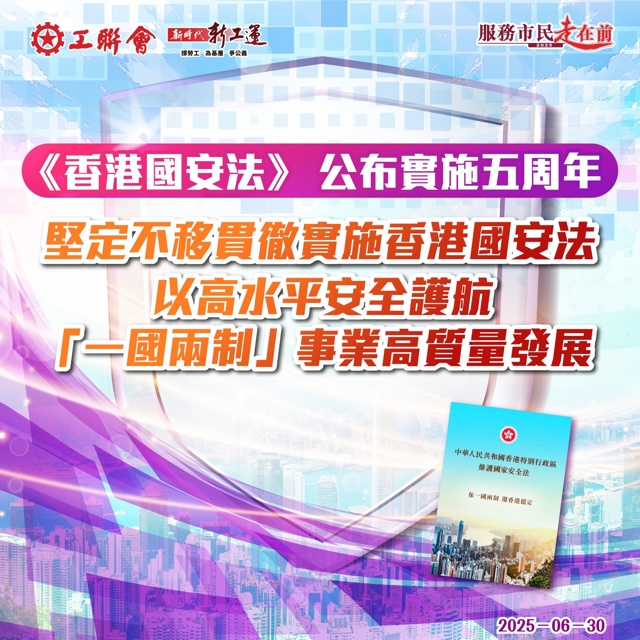 今日(2025年6月30日)是《中华人民共和国香港特別行政区维护国家安全法》(《香港国安法》)颁布实施五周年的重要日子。工联会对此表示坚定支持!