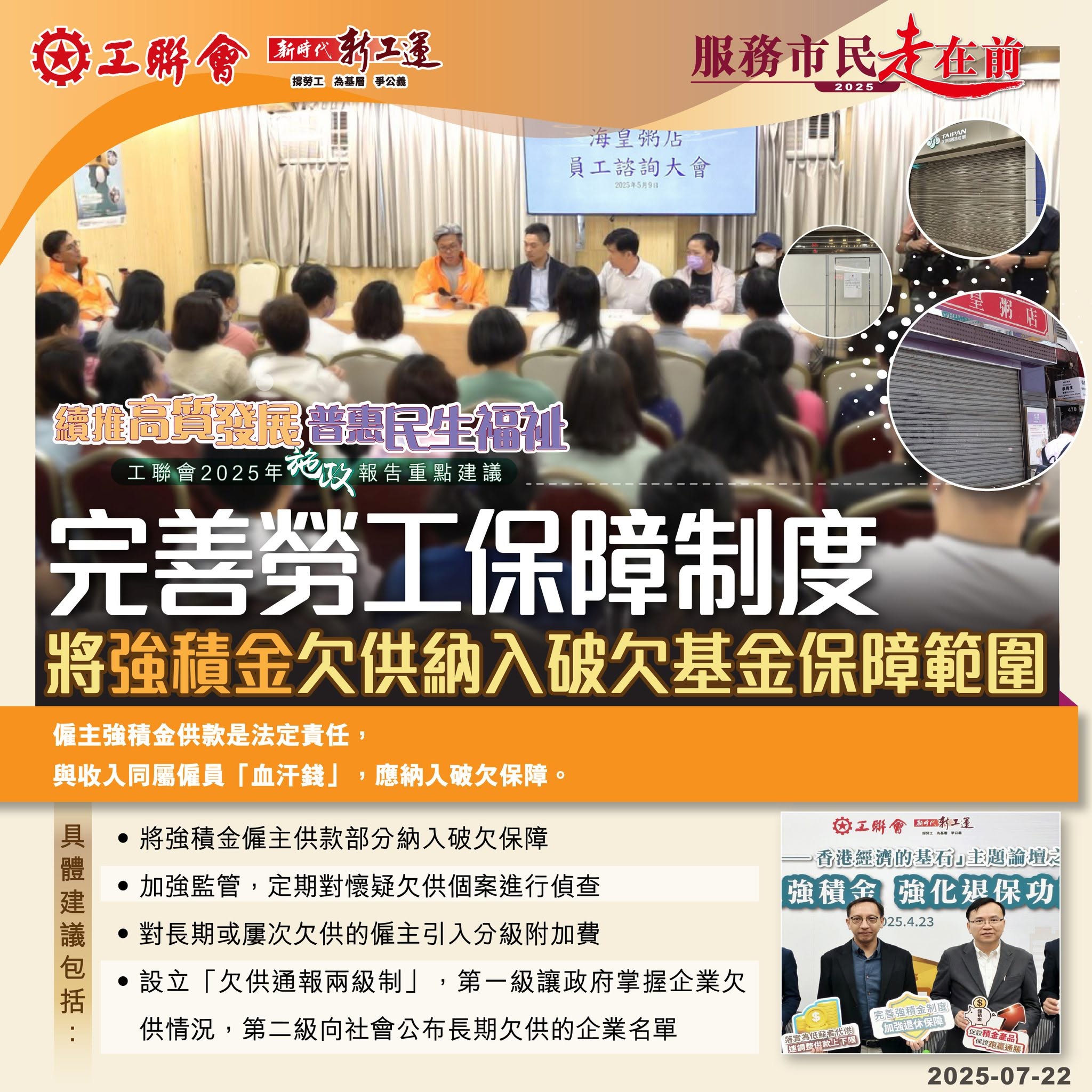 2025-07-22 【2025施政报告重点建议】续推高质发展 普惠民生福祉:完善劳工保障制度 将强积金欠供纳入破欠基金保障范围