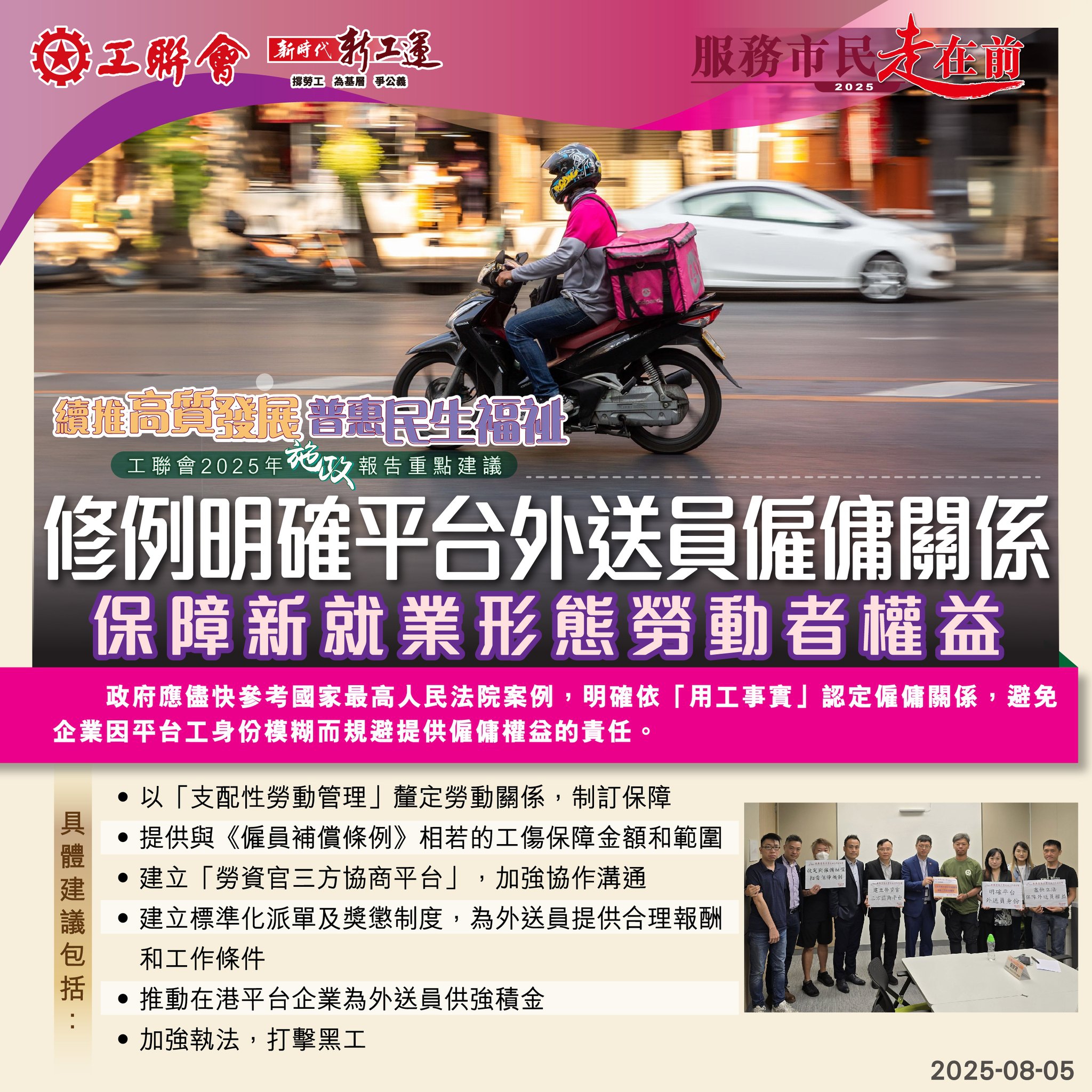 2025-08-05 【2025施政报告重点建议】续推高质发展 普惠民生福祉:修例明确平台外送员僱佣关系,保障新就业形态劳动者权益