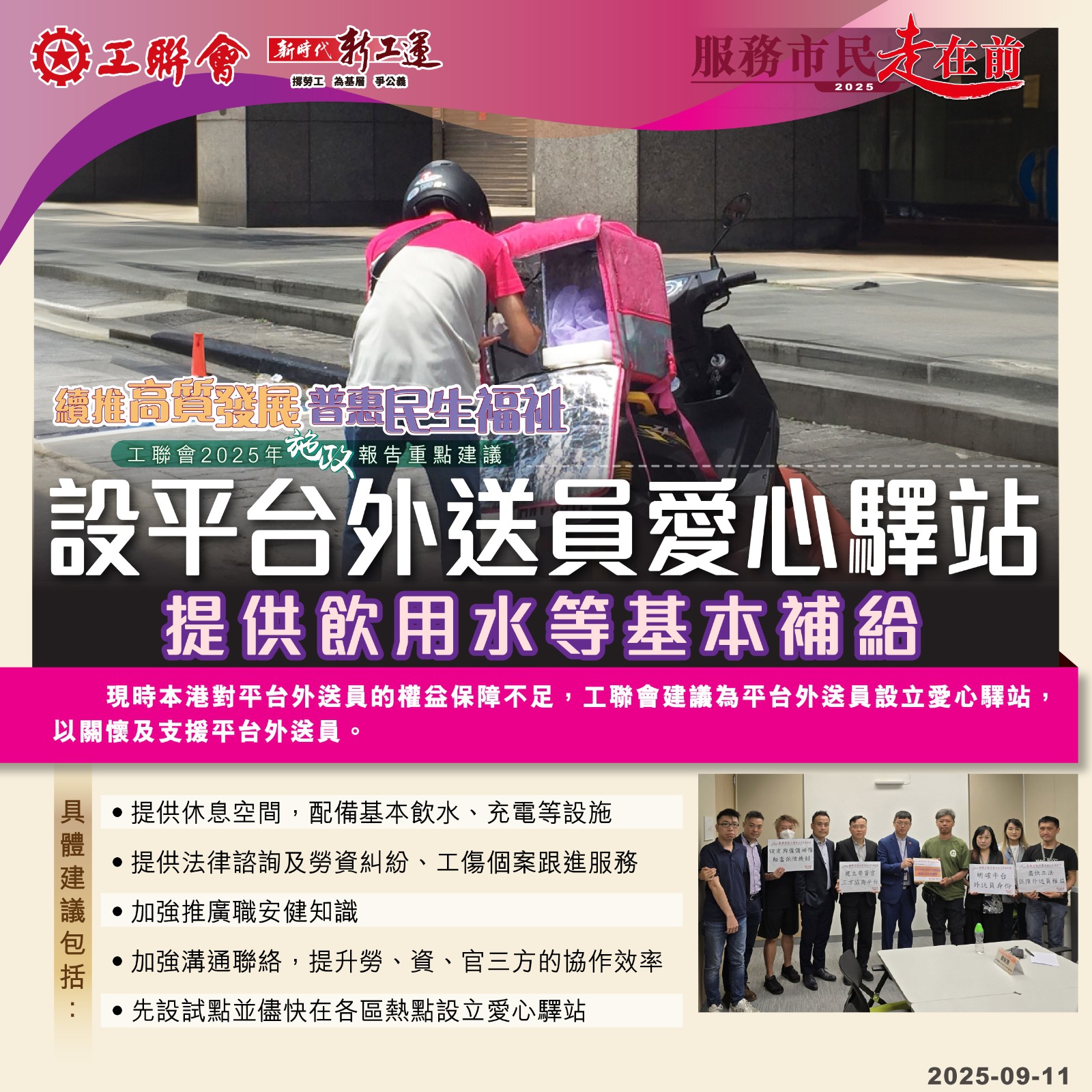 2025-09-11 【2025施政报告重点建议】续推高质发展 普惠民生福祉:设平台外送员爱心驿站 提供饮用水等基本补给