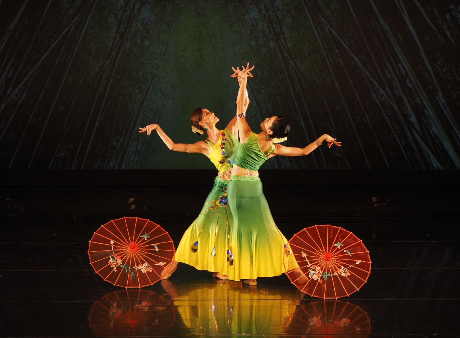 葫蘆絲(獨奏及雙人伴舞)《竹林深處》 蔡清風大師吹奏著古樸、典雅的葫蘆絲,樂韻悠揚而獨特;傣族姑娘優美的體態,竹林中盡見柔美和詩情畫意,心靈在林中深處飛翔。