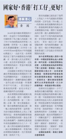 對於國務院總理李克強在3月5日發表政府工作報告,工聯會認為在過去五年祖國各方面發展成績顯著,國民收入增長高於經濟增長,人民生活持續改善,突顯社會主義制度優越性,為實現全面小康更推進一步,全國人民都會對國家的發展感到自豪。政府工作報告中提到全力支持香港、澳門特別行政區政府和行政長官依法施政,足見國家對貫徹「一國兩制」方針的堅守。從報告的篇幅可見,中央要求香港集中精力在經濟民生發展,如「粵港澳大灣區」及「一帶一路」建設。此外,我們建議將習近平總書記在「十九大」報告中的「讓香港、澳門同胞與祖國人民共擔民族復興的歷史責任,共享祖國繁榮富強的偉大榮光」寫入政府工作報告,喚起兩岸四地人民的愛國情懷。