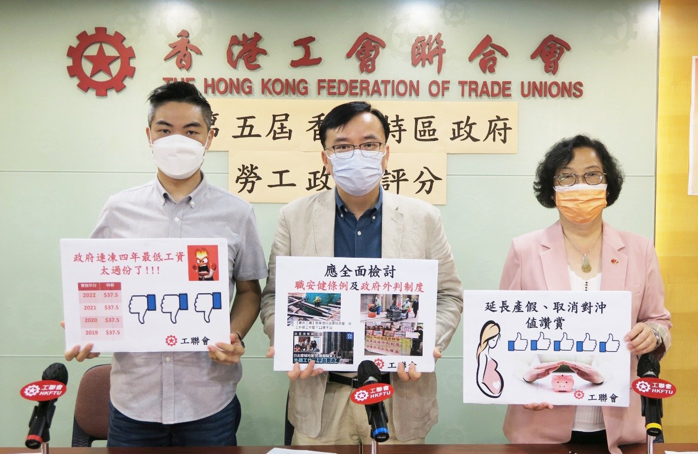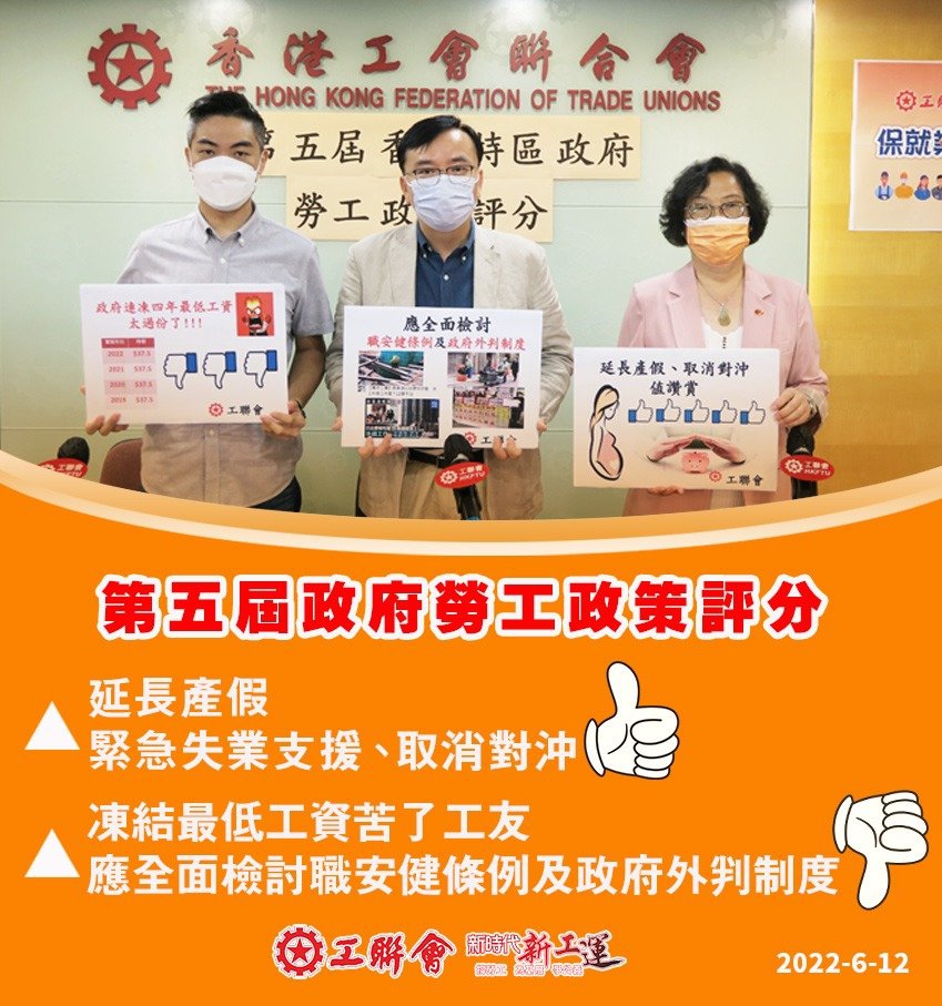今屆行政長官任期將於2022年6月30日屆滿,工聯會特別檢視本屆政府在勞工政策方面的表現。在12項重要勞工政策中,給予最高評價為政府落實「延長有薪產假至14週」;但「提高職業安全與健康法例罰則」、「全面檢討政府外判制度」、「最低工資被凍結」則成為評分最低的項目,尤其是因政府未能發揮協調作用,令最低工資在2021年被凍結,底層員工被迫凍薪4年。希望新一屆政府除能夠多聆聽勞工界聲音,與勞工界一起繼續改善300多萬僱員的勞工權益。