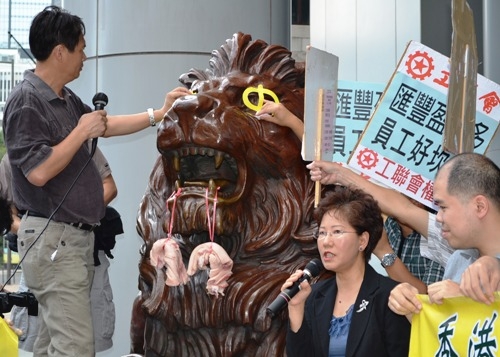 權委及工會與數十名會員在匯豐銀行總行外,將肥豬肉放在獅子口中,諷刺匯豐銀行肥上瘦下,不理員工飯碗。