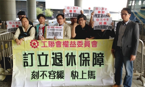 香港工會聯合會權益委員會(工聯權委)約10名代表,趁福利事務委員會退休保障事宜小組委員會會議上討論香港退休保障議題到立法會會門外請願,建議政府實施「退休保障制度綜合方案」,權委亦向委員會提交下列意見: