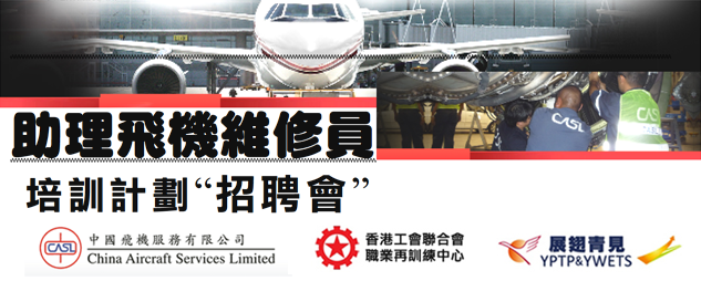 招聘日: 05/08/2015(三),1:15pm 九龍土瓜灣馬頭涌道50號工人俱樂部9樓 (面試成功學員可參與為期15天的免費職前培訓課程) (職前培訓課程日期:12﹣31/08/2015) 工作範疇: 在工程師及督導員指示下進行飛機維修工作 工作時間: 每星期工作5天(輪休),每天基本工作8小時(輪班) 工作地點: 赤鱲角 聘用條件: 基本工資: 月薪$8,000 申請資格: 18﹣24歲,持有香港身份證,完成中學教育程度(或同等學歷)至副學位程度的離校青少年 津貼及福利: 膳食津貼、交通津貼、勤工獎及制服清洗津貼(合共約2000 元)、加班補償、 週年酌情獎金、年終雙糧、優惠機票、醫療、牙科及保險福利 面試請帶備: 身份證、履歷表、相片1張、學歷及工作證明文件正副本(如有)、文具