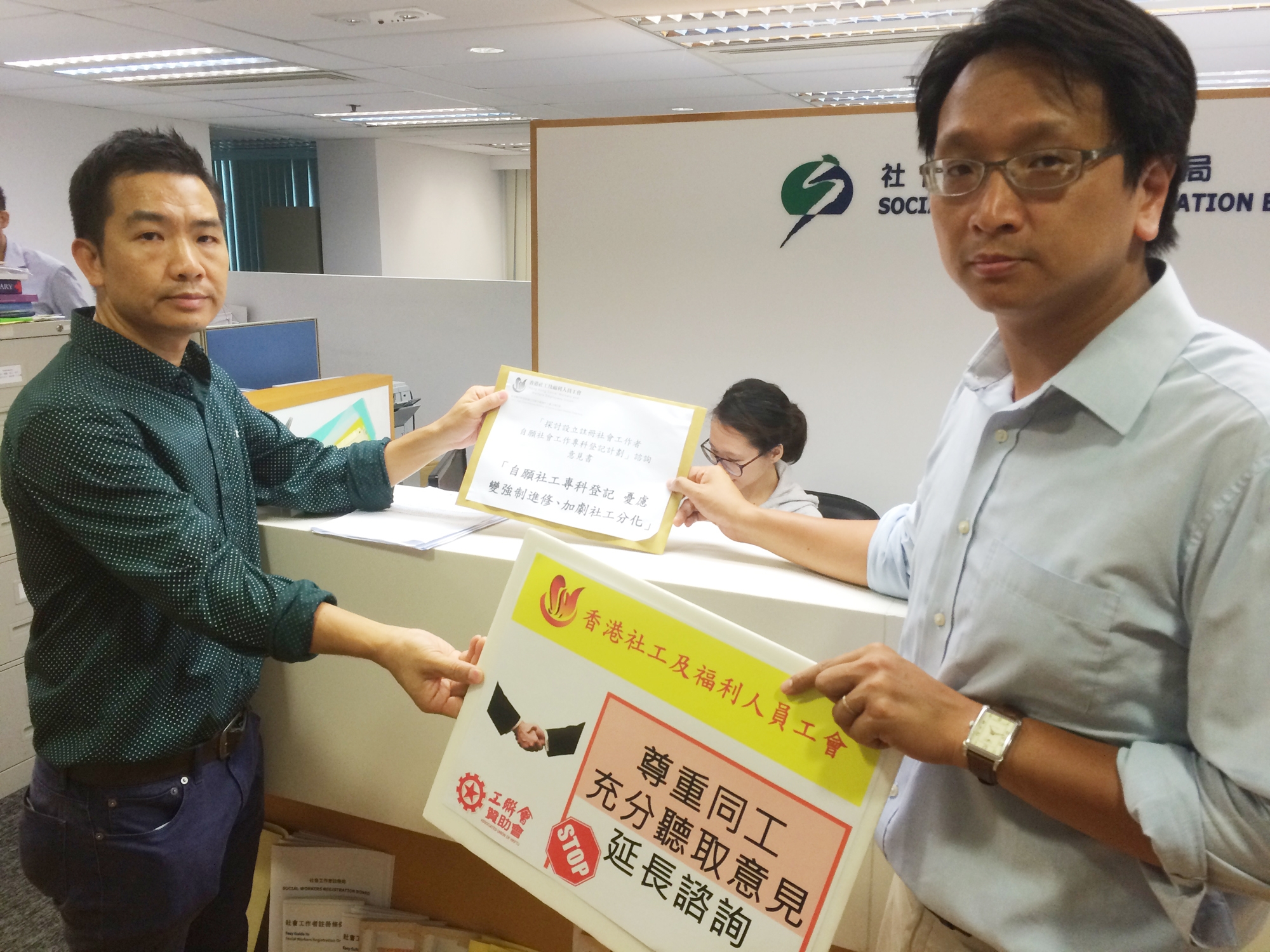 社會工作者註冊局正就設立「社會工作者自願社會工作專科登記計劃」(自願專科登記計劃)進行諮詢,並提出建議,若社工符合一定資格,能夠使用「資深及專科社工」的稱號。香港社工及福利人員工會主席鄧家彪及副主席陳義飛在8月14日,特別到社會工作者註冊局遞交意見書,要求社工註冊局,延長諮詢「社會工作者自願社會工作專科登記計劃」。