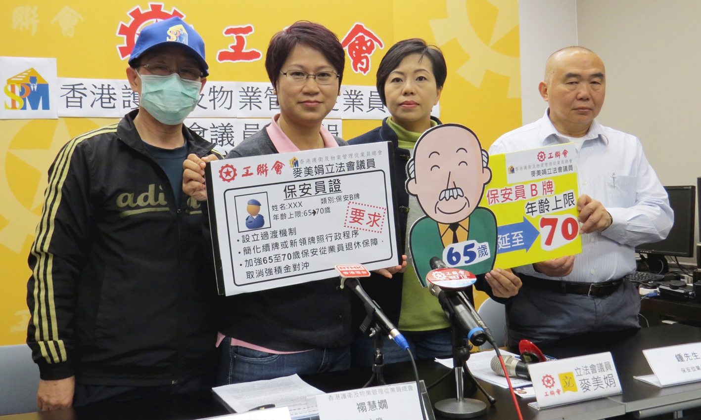 工聯會多年來一直爭取放寬保安員發牌準則所訂的年齡限制,至今年6月份立法會終通過有關條例修訂,將保安員B牌(乙類保安人員許可證)年齡上限由65歲提高至70歲。對於政府今日公布有關新例將於本月18日起實施,立法會議員麥美娟及香港護衛及物業管理從業員總會主席禤慧嫺對政府接納工聯會的倡議表示歡迎,認為有關措施有助紓緩保安行業內人手不足的問題,亦鼓勵長者繼續就業,但建議政府應同時放寬只限在單幢式物業工作的甲類(A牌)保安人員許可證的工作範圍,進一步減少目前業內「有牌冇工做」的情況。麥美娟亦關注到按現行法例,若放寬B牌年齡上限後,65歲或以上的保安人員並不納入強積金計劃涵蓋範圍,認為應交由勞工處物業管理三方小組跟進,而政府應以身作則加強對其65歲或以上合約保安員工的退休保障,包括針對保安行業大多為短期合約制常遭遣散的問題,牽頭取消強積金對沖。
