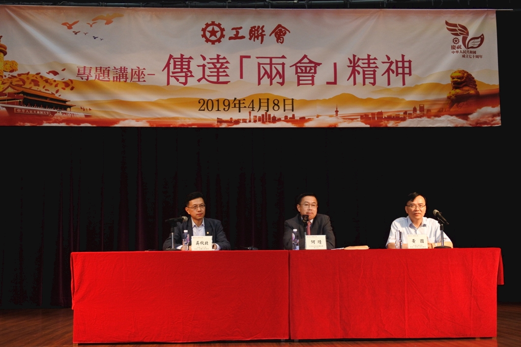 全國人大代表會議及全國政協會議於三月圓滿舉行,當中涉不少與香港市民息息相關的議題。工聯會在4月8日舉行傳達「兩會」精神專題講座,由中聯辦副主任何靖和港區全國人大代表、工聯會會長吳秋北主講,全國政協委員、工聯會理事長黃國作講座主持。 吳秋北先以「聚焦民生,共享發展」為主題,希望大家從多角度深入了解「兩會」精神,傳達愛國愛港的精神。他表示,今年「兩會」審議了七個報告,一部法例。報告中,有12個範疇是聚焦在民生方面的,深深感受到國家對民生的關懷,在面對各種壓力下仍堅持減稅減費,體現政府希望更好地發展經濟的意願。 吳秋北特別指出,兩會強調「就業優先」的政策與工聯會一直推動的工作脗合,符合發展經濟要先帶動就業的理念。工聯會在「兩會」期間也提出很多建議,包括粵港澳大灣區信息安全和隱私保障、大灣區的安老政策、灣區內的職業資格互認等,這些都是與經濟民生,粵港澳大灣區人才互動、交流等方面息息相關的,他鼓勵大家更積極地就粵港澳大灣區建設建言獻策。 何靖則用了「三個心」概括了今年全國「兩會」的特點:一是信心;二是民心;三是關心。 「信心」方面,何靖表示,在世界經濟整體趨向下行的狀況下,政府在這次「兩會」向中國人民交出了一份亮麗的成績單和宏偉藍圖,大大地提振了人民對國家富強、民族復興的信心。而今年「兩會」提出「穩就業」、「穩金融」和「穩外貿」,相關政策都是非常「接地氣」和務實。 「民心」方面,何靖指出「兩會」充分凝聚了「民意」和「民智」,國家主席習近平6次便親臨到小組會議,細心聽取意見和發言。所有代表提出的1200多項修例和逾33萬條從網上收集的建議中,部份具代表性的建言被參考採納,反映政府願意聽取人民的聲音。報告當中也部分採納了港區全國人大代表的意見,包含着「特區智慧」、「香港力量」。 至於「關心」方面,何靖表示,「兩會」提到港人關心的粵港澳大灣區規劃。灣區各階段的發展讓中國走向小康社會,再逐步走向文明民主的強國之路;而香港參與灣區發展,亦可從中獲益,讓香港拓展更大「空間」,解決土地不足、成本高和樓價高等問題,豐富「一國兩制」的實踐。 最後,何靖引用習近平主席「三個相信」作為結束語:「相信自己、相信香港、相信國家」。他希望工聯會會員應該有更足夠的底氣和信心,共同創造更美好的未來。吳秋北亦表示,希望可以透過今次活動,更好地傳遞兩會精神,更好地激勵大家做好各項工作,這也是為國家做出的貢獻。