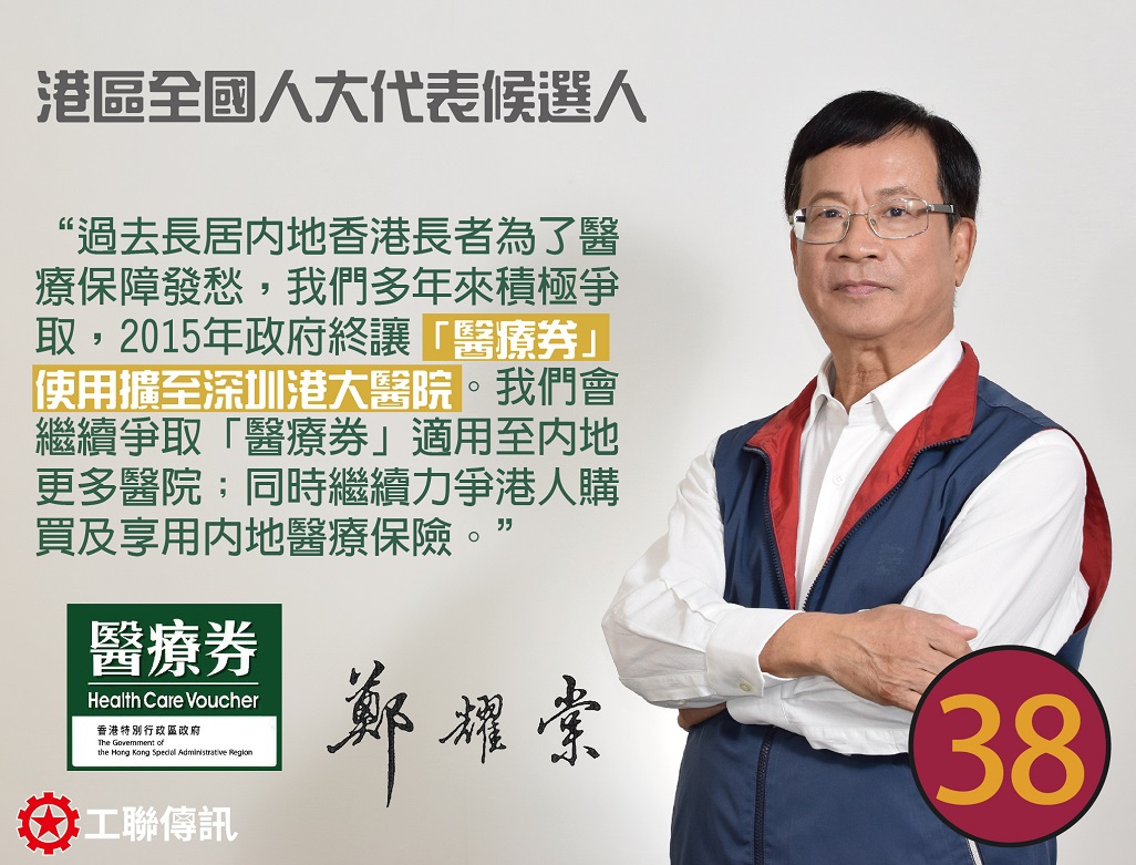 懇請各選委,支持38號港區全國人大代表候選人,明日投鄭耀棠一票。