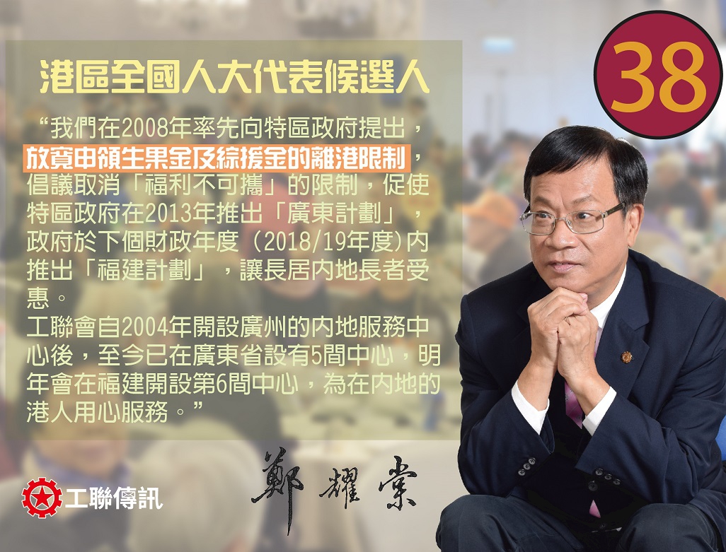 工聯會榮譽會長鄭耀棠表示,工聯會在2008年率先向政府提出,放寬申領生果金及綜援金的離港限制,倡議取消「福利不可擕」的限制,促使政府在2013年推出「廣東計劃」。政府於下個財政年度(2018/19年度)內推出「福建計劃」讓長居內地長者受惠。