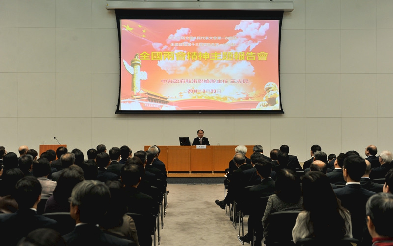 全國人大代表、中央政府駐港聯絡辦主任王志民應邀出席特區政府「全國兩會精神主題報告會」,為特區政府高級官員宣講全國「兩會」精神。王志民主要圍繞大會盛況、習近平總書記在十三屆全國人大一次會議閉幕會上的重要講話、政府工作報告、憲法修正案和機構改革等作了全面的介紹,並對涉及香港的內容作了深入解讀。 王志民指出,今年的全國「兩會」議題之多之重、會風之嚴格之清新、代表精氣神之自信之振奮、成果意義之重大之深遠,都前所未有。整個會議充滿了激昂向上的正能量,是新時代國運昌盛的經典呈現。王志民以結合播放幻燈片和“兩會”現場視頻的形式,與特區政府官員分享了這次大會中激動人心的三個經典時刻,包括憲法修正案以創歷史記錄的超高票通過,習近平總書記全票當選國家主席並進行憲法宣誓,以及習總書記在閉幕會上發表重要講話。他強調,在這幾個經典時刻中,人民大會堂回蕩著一次又一次長時間的熱烈掌聲,體現了習總書記是全黨擁護、人民愛戴、當之無愧的黨的核心、軍隊統帥、人民領袖,是新時代中國特色社會主義國家的掌舵者、人民的領路人,體現了全體代表對這次修憲最重要政治成果的高度認同,代表了13億多人民對習總書記深厚愛民情懷、為民憂民的政治立場和作為全黨全軍全國各族人民主心骨的高度認同和由衷擁戴,説明了13億多人民對在習總書記堅強領導下,風雨無阻、高歌行進,實現中華民族從“富起來”到“強起來”的歷史飛躍的堅定意志和奮鬥偉力。 王志民指出,習總書記在閉幕會重要講話中再一次談到「一國兩制」事業,在全場22次掌聲中,涉及港澳台工作部分的掌聲就達到6次。聯想到習總書記從去年七一視察香港到在十九大報告中大篇幅論述「一國兩制」事業,從高度肯定上京述職的林鄭月娥行政長官開局工作到春節前不到10天接連對饒宗頤先生逝世、大埔交通事故、「少年警訊」成員致信作出重要指示批示,讓我們深深感受到“一國兩制”事業作為中國特色社會主義的重要組成部分,作為我們黨治國理政的重大課題,在習總書記和全國人民心中的分量,深深感受到習總書記對港澳同胞深厚的人民情懷,習總書記在中南海始終牽掛香港發展、始終直通香港同胞,中南海不僅始終引領我們把實行社會主義制度的內地建設好,也必將引領我們把實行資本主義制度的香港建設好。 王志民認為,今年的政府工作報告通篇貫穿了十九大精神,用翔實數字和豐富事例生動詮釋了「歷史性成就、歷史性變革」。他表示,「支持香港、澳門融入國家發展大局”是中央作出的一項具有戰略意義的決策,為香港發展指明了戰略方向。粵港澳大灣區為香港融入國家發展大局提供了戰略支撐和重要平台。」習總書記在參加廣東代表團審議時指出,「要抓住建設粵港澳大灣區重大機遇,攜手港澳加快推進相關工作,打造國際一流灣區和世界級城市群」。只要我們堅守「一國」之本、善用「兩制」之利,在中央的強有力統籌領導下,把充分發揮「一國兩制」的獨特製度優勢和粵港澳三地各自特色優勢有機結合,有效提升區域的整體競爭力,完全可以實現多贏共榮,打造國際一流灣區,從而形成一個更加多元、更具活力的灣區經濟社會發展共同體和安居樂業的共同家園。 王志民介紹了黨和國家機構改革方案,他表示,經過此次重塑性變革,黨和國家機構職能體系更加系統完備、科學高效,不僅將為新時代我國經濟社會發展提供更強大的驅動力,也必將推動我國國家治理能力和治理水平在世界範圍內從跟跑向並跑、領跑轉變。這次黨和國家機構的改革,不僅與內地同胞息息相關,對特區政府和廣大香港同胞來説同樣是利好,為香港更好地融入國家發展大局和廣大香港同胞更好地共享國家發展機遇帶來更多「改革紅利」和「政策便利」。比如成立國家國際發展合作署,對於香港充分發揮國際網絡優勢、參與國家“一帶一路”建設、扮演好“超級聯繫人”角色等,提供了更好的平台;重新組建的科學技術部,將對香港的創新科技發展起到重要推動作用,有利於香港充分發揮在特色領域重大科技創新上的實力和潛力;省級及省級以下國稅地稅機構合併,簡化稅務徵管體制,將給港資企業和香港同胞在內地發展創業提供便利,等等。王志民還針對特區政府官員關心的對口聯繫的中央部門是否發生變動、其職責如何調整等問題作了解答,並梳理了特區政府的機構設置與黨和國家機構設置之間的大致對應聯絡關係,供特區政府官員參考,並表示中聯辦將在今後聯絡交流上為特區政府和社會各界提供更多幫助。 王志民強調,把十九大精神以及全國「兩會」精神進一步在香港宣介好落實好,目的是為國家為香港更好發展服務,這是中聯辦和特區政府的共同願望和責任。中聯辦一定會繼續堅定支持林鄭月娥行政長官和特區政府帶領香港社會增強國家意識和愛國精神,增強憲法意識、弘揚憲法精神,增強政權意識和國家安全意識,增強融入國家發展大局的意識和能力。中聯辦將繼續與特區政府同心同氣、並肩同行,努力奮鬥,共同推動香港「一國兩制」成功實踐行穩致遠。