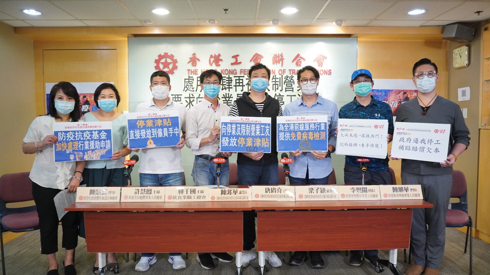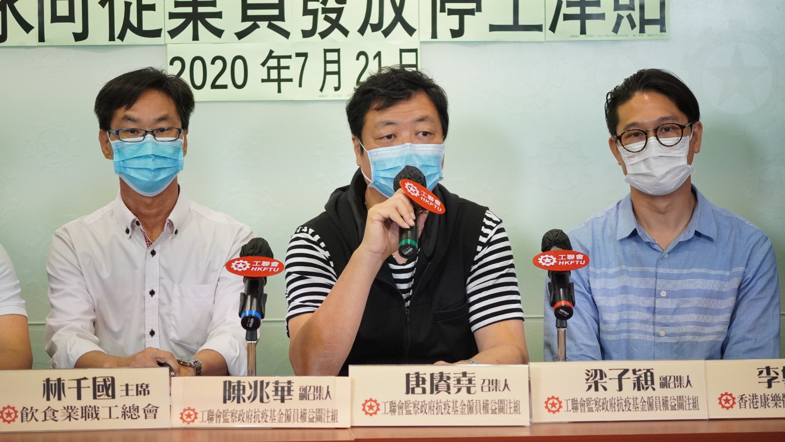 新冠疫情反覆,政府更再次收緊防疫措施,其中12類所處被勒令關閉停業,而食肆亦被禁止在晚上經營堂食業務。工聯會監察政府抗疫基金僱員權益關注組(關注組)今日 (7月21日)聯同受影響的行業工友召開記者會,要求政府為受影響行業僱員提供停工津貼,並要求津貼要直接發放到工友手上;另外,亦呼籲政府儘快為全港所有前線服務行業僱員提供免費新冠病毒檢測,以堵截及查找病源,讓市民儘快恢復外出信心,以振興經濟及消費。 近日新冠疫情再度爆發,護老院、的士、食肆等工作場所相繼出現確診個案群組。關注組召集人唐賡堯指政府因而進一步收緊社交距離措施,下令美容院、健身中心、按摩院等12類處所需暫停營業14日,並要求食肆在下午6點至上午5點不能經營堂食業務,令到該些企業經營再次陷入停擺。 唐賡堯指出,有公司已要求員工再次放無薪假,美容、健身等自營作業者亦不能為已預約的顧客提供服務,收入生計頓失;食肆晚市收入亦大減,員工憂慮公司會再次扣減薪金。他憂慮,隨着疫情未能受控,限聚措施將會持續及隨時收緊,令剛步入恢復的經濟再次受到打擊,工友收入亦受影響,故要求政府為被勒令停業的行業員工發放停工津貼,以支持工友維持生計。停工津貼應以員工平均日薪計算,上限9,000元。 關注組副召集人梁子穎認為政府既然勒令12類處所暫停經營,故向受影響員工發放停工津貼以彌補損失實責無旁貸。另外,早前政府防疫抗疫基金只向企業老闆發放津貼,但不少工友反映,他們根本無法直接得到任何援助,故梁認為停工津貼必須直接發放到工友手上,避免再出現只有僱主受惠情況。 出席記招的香港美容健體專業人員總會主席許慧鳳、香港推拿理療專業人員總會理事長陳旭華皆表示,早前申請抗疫基金的美容院及按摩院補助,但至今仍未收到政府的津貼,而現時政府再次要求行業停業,僱客的預約需延期甚至取消,無疑令到業界經營雪上加霜。髮型化妝整體形象設計師總會理事陳慧麗指,行業中有持有合格自僱人士強積金戶口的工友,申請「保就業」計劃中7,500元津貼竟被拒,但當局至今仍未提供清晰原因,因此,代表促請當局加快審批抗疫基金的申請及儘快回覆工友申請失敗的原因。 香港康樂體育專業人員總會會長李粵閩指,政府對業界的抗疫基金援助只保障競技運動教揀,未有覆蓋其他大眾普及運動的教練及助教,如健身、瑜伽、舞蹈等,導致業界中有起碼超過一半的從業員得不到任何抗疫基金援助,代表稱,政府再次收緊限聚措施,業界從業員只能繼續垂死掙扎,他要求政府必須正視業界慘況,對被要求停業的工友作出補償。 政府亦禁止食肆晚上經營堂食,飲食業職工總會主席林千國指措施令到整體生意額下跌約四成,由於無需服務堂食客人,部份工友被僱主要求放3.5天無薪假。工會批評,政府突然推出限聚措施,卻無任何補償僱員措施,令到工友陷入兩難。工會認為飲食業僱員是失業的重災區,故建議政府為飲食僱員提供類似建造業僱員的一次性7,500元的資助,以及發放像是清潔保安行業的抗疫辛勞津貼予飲食業從業員。 關注組副召集人陳兆華提到政府公佈為的士司機進行免費檢測病毒,但其實亦有為巴士司機提供相關服務,但政府卻沒有向市民提供有關信息,有機會讓市民擔心乘搭公共交通工具的安全。梁子穎認為政府早前公佈只為四類行業的人士提供免費病毒檢測並不足夠,前線工友一直暴露於疫情風險,例如小巴司機現時亦沒有涵蓋,他呼籲政府儘快為全港所有前線服務行業僱員提供免費的新冠病毒檢測,以堵截及查找病源,讓前線工友安心工作,市民儘快恢復外出信心,以振興經濟及消費。 關注組要求政府從速推出以下措施,援助被限制營業影響的工友: 選舉廣告 自行製作:九龍土瓜灣馬坑涌道12號3樓 1張 2020年7月21日![]()