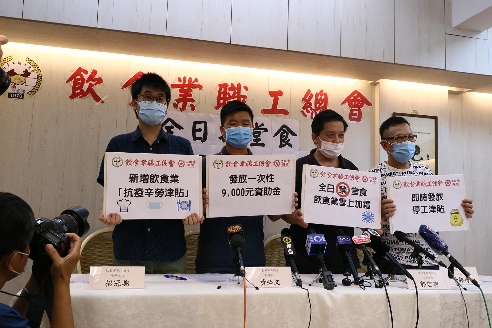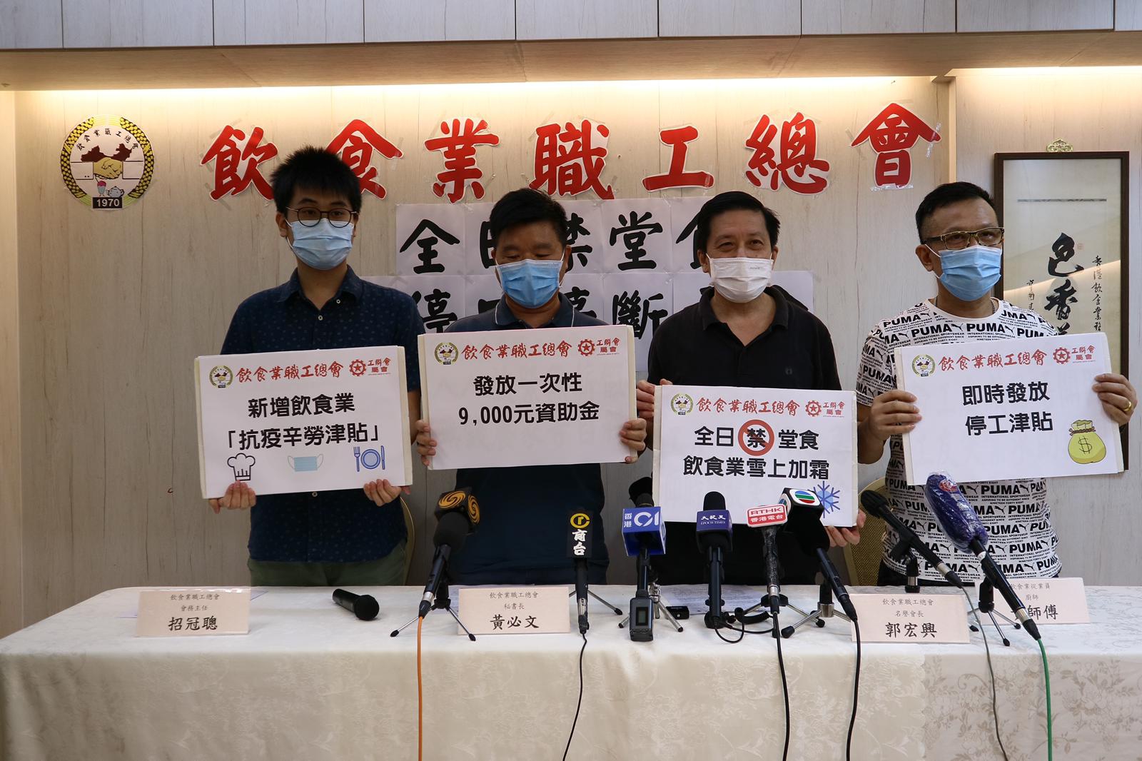 飲食業職工總會今天(7月29日)舉行記者會,指食肆今天起全日禁止堂食導致酒樓被迫停業、食肆收入大降,勢必對超過24萬的飲食業僱員造成「毀滅性」打擊。無數工友將繼續面臨被迫放無薪假,停工,甚至是裁員的厄運,因此飲食業職工總會促請政府即時直接向飲食業僱員發放每月上限9,000元的「停工津貼」,並且效法建造業抗疫基金向每名飲食業僱員發放一次性9,000元的資助金,同時發放為期6個月,每月1,000元的「抗疫辛勞津貼」。 飲食業職工總會名譽會長郭宏興指,原先食肆「晚六朝五」禁止堂食的抗疫措施已導致不少工友被僱主要求放3至7天的無薪假,洗碗和樓面等工友的收入亦減少至少一半,業內為數約5萬名的散工更被迫即時停工。如今政府進一步全日禁止堂食,不少食肆,特別是中式酒樓及婚宴場所等收入來源主要依靠堂食的食肆只能選擇停業,連鎖反應就是不論長工或散工的飲食業僱員紛紛被僱主通知「唔駛返工」。飲食業僱員更害怕復工無期,擔心禁止堂食「七日期限」之後又是另一個「七日期限」,對於未來是否能夠復工毫無把握。 飲食業職工總會權益幹事招冠聰表示,自年初疫情爆發後飲食業一直是疫情的重災區。餐飲服務活動業7月份公布的失業率已高達14.7%,比起全港6.2%的失業率高出8.5個百分比,而就業不足率亦急劇上升至8.2%。雖然政府推出「保就業」計劃防止出現裁員潮,但工會收到許多會員反映,不少飲食業僱主雖然利用僱員的強積金供款紀錄成功申請「保就業」計劃,但仍然要求僱員放無薪假。飲食業的特色是「手停口停」,僱員一旦實際上班工作日子減少,收入隨即下降,根本受惠不到「保就業」計劃的幫助。同時,在政府推出食肆「晚六朝五」禁止堂食的措施時,不少飲食業僱員已聽聞僱主因無法正常營業,正考慮將「保就業」計劃的資助全數退回政府,寧願結業選擇止蝕離場,令到員工人心惶惶。 因此,就食肆全日禁止堂食對飲食業僱員造成的「毀滅性」打擊,以及「保就業」計劃的成效不彰,飲食業職工總會秘書長黃必文向政府提出三項建議: 工會希望政府在推行抗疫措施的同時,要考慮業界從業員的生計影響,為行業工友提供應有的保障。