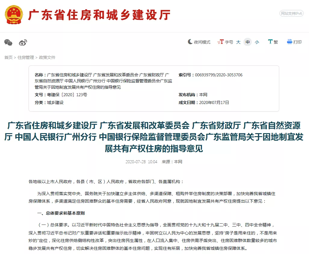 廣東省住房和城鄉建設廳等六部門日前聯合印發《關於因地制宜發展共有產權住房的指導意見》(以下簡稱《意見》)。在廣東省工作和生活的港澳居民納入共有產權住房的供應範圍。 共有產權住房是由政府提供政策支持,實行政府與承購人按份共有產權,並限定處分權利的政策性住房,政府和承購人共擔風險、共用利益。《意見》從共有產權住房建設管理、分配管理、供後管理以及用地保障、財政金融稅費支持各項保障措施等方面,對共有產權住房的發展給予了明確指導及政策支撐。 《意見》明確指出,共有產權住房面向符合當地規定條件的城鎮無房家庭(含單身居民)供應。各地應將符合條件的人才、城鎮穩定就業的外來務工人員、在廣東省工作和生活的港澳居民納入共有產權住房的供應範圍。 每戶家庭只能購買一套共有產權住房,可將人才住房納入共有產權住房。共有產權住房需按市場價銷售,保障對象出多少錢就占多少產權比例,不存在優惠價;承購人的產權份額則為銷售價格(即承購人實際出的錢)占評估價格(即房屋通過評估確定實際值的錢)的比例。原則上,該比例不低於50%,其餘部分為政府產權份額,產權份額應由國有機構代為持有。共有產權住房建築面積不超過120平方米。 《意見》提出,共有產權住房將通過7個籌集管道籌集房源。包括政府組織集中建設;通過“限房價、競地價”等方式由房地產開發企業集中建設;通過“限地價、競配建”等方式在商品住房專案中配建等。