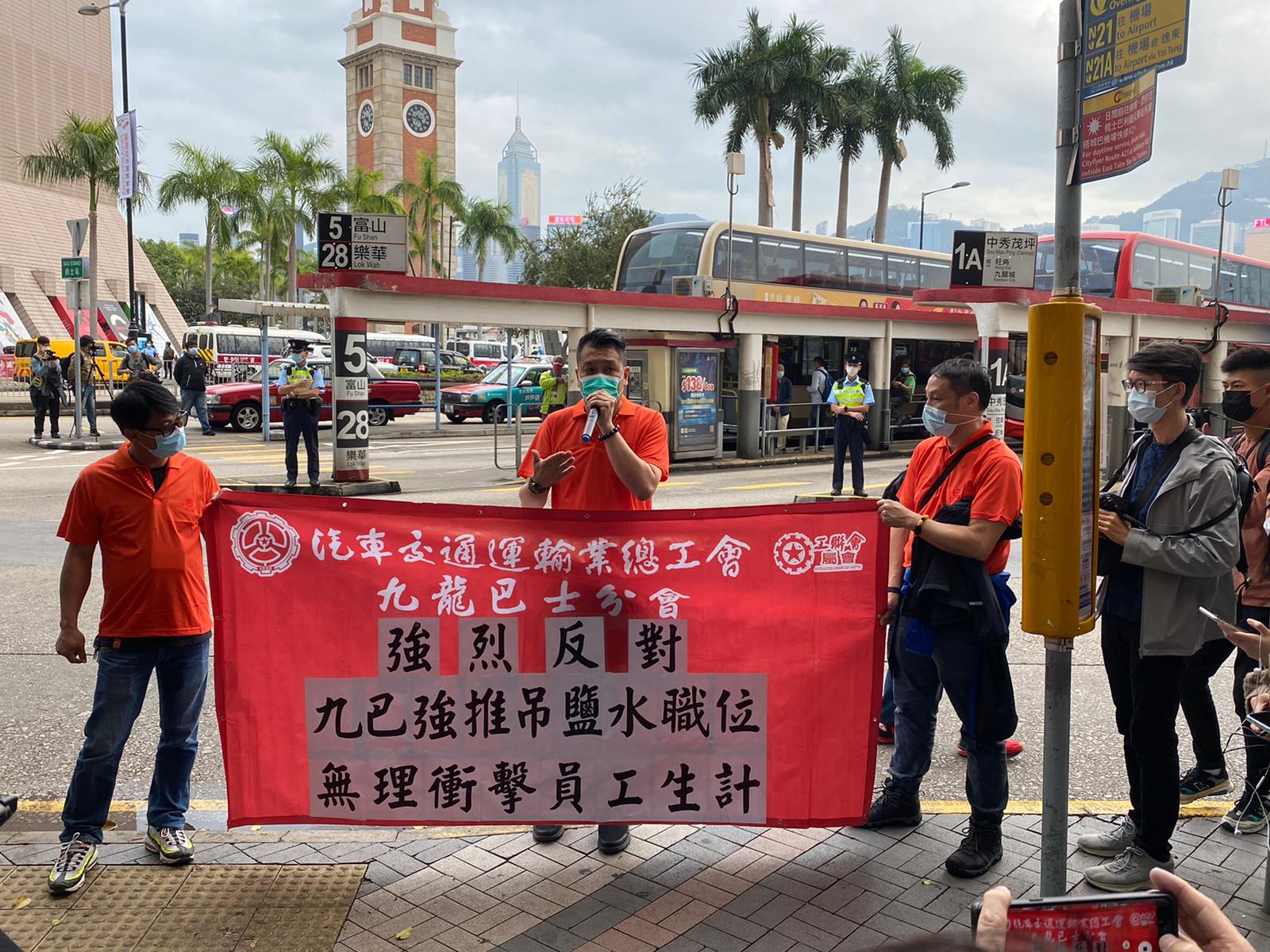 九巴公司在沒有徵詢員工和工會的意見下,強行要求退休續約和合約員工在約滿後簽訂只能半職工作的合約,引起受影響員工的強烈不滿,而現職員工亦感到資方冷漠無情,擔心自己日後也要遭遇這種困境。對此,汽車交通運輸業總工會九龍巴士分會(九巴分會)在與資方舉行會議,以表達員工的憂慮和要求資方擱置這項衝擊員工合理權益的措施。可惜的是,資方採取蠻橫的態度,完全不理會工會代表的意見,使談判不歡而散。為了表達廣大員工的不滿,九巴分會在2月25日下午4時半在尖沙咀碼頭巴士總站採取示警式的封站行動,並要求政府官員即時介入斡旋,以保障廣大九巴員工的合理權益。 九巴分會主任黎兆聰指出,九巴公司在政府推行的保就業計劃結束後,便叫苦連天,表示營運十分困難。可是,九巴公司近期則公開表示會增聘800名員工,而且很多員工看到九巴公司不斷購置新車,再加上政府在過海隧道基金中撥出資源來舒緩九巴公司的營運壓力,使很多員工都認為九巴公司的財政有所改善。 然而,九巴公司突然強行推出要求退休續約和合約員工在約滿後簽訂只擔任半職工作,使受影響員工的收入劇減三份之一。不僅如此,對於很多續約員工來說,九巴公司管理層已經口頭承諾他們在簽訂新合約後,可以原職原薪地返回原有的工作崗位,可是這項半職工作安排,使他們均感到十分愕然,也認為資方違反了勞資協議。更甚者,很多需要續約的員工也被調離原有的工作更份或地點,使他們遇到很大的工作難題和壓力。對於受影響員工的人數,黎兆聰估計在短期內會達到1000人。 對於九巴公司強行推出這項無理措施,黎兆聰認為廣大九巴員工在新冠疫情下,也體諒公司所面對的營運處境,一直堅守工作崗位,在很大程度上減低巴士公司的財政損失。然而,九巴管理層完全無視員工的付出,反而推出損害員工合理權益的措施,使人感到資方十分涼薄。 為了表達廣大員工的強烈不滿,黎兆聰表示九巴分會這次只是採取一種示警式的封站行動,要求資方拿出誠意,盡快與工會代表進行磋商和解決問題,以免事態進一步惡化。另外,九巴分會也要求政府部門即時介入,在協助廣大員工解決問題的同時,也維持九巴能夠維持一個良好和安全的服務質素。