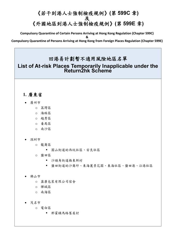 6月6日,特區政府進一步調整「回港易」計劃內風險地區名單,除了國家衛健委所列的中、高風險地區外,參考內地和澳門衛生部通報個案,以小區為最小單位,將以下地區列為暫不接受免隔離的範圍。 工聯會深圳諮詢服務中心(深圳中心)提醒各位內地港人,回港日期前14天,如果曾經在上述地區逗留,將無法通過「回港易」計劃豁免強制檢疫,入境香港需要接受14天酒店或居家檢疫。 目前廣州市部分地區已經嚴格管控,市內中、高風險地區內的人員不能離開所在區域,并呼籲其他區域的居民非必要不離開廣州市,需要離開廣州市必須持有48小時內的核酸檢測陰性證明。深圳市也在以社區為單位進行核酸檢測,出入公共場所嚴查健康碼。 深圳中心呼籲大家出門帶好口罩做好防疫措施,盡量避免前往人群集中的高風險場所。有意使用「回港易」計劃的港人,請在預約前查看香港政府網頁最新的隔離政策與風險地區名單,或致電內地中心查詢。