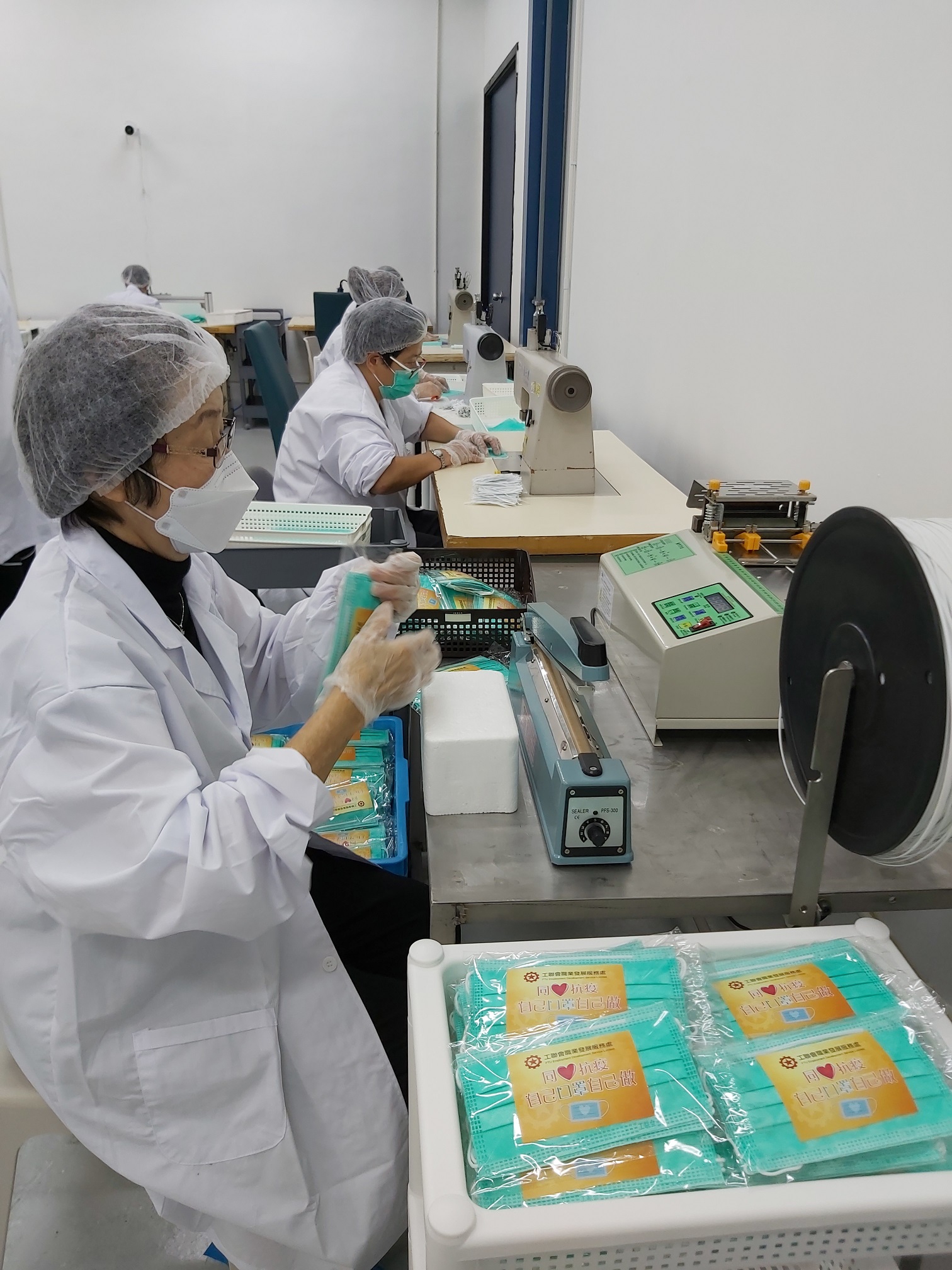 疫情後,口罩需求大增,本著「自己口罩自己做」的想法,工聯會職業發展服務處開設口罩工場,經過短短半個月時間,首批成品正式面世。整年間,工聯會多次收到捐款,支持製造口罩,而工聯會亦於整年間多次送贈口罩給予所需的工友及巿民。