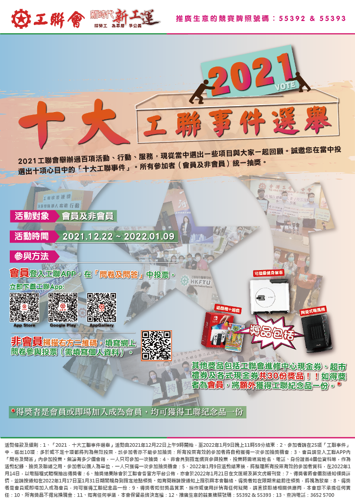 - 抽獎結果除會於工聯會各官方平台公佈,亦會於 2022 年 1 月 21 日在文匯報及英文虎報刊登。
