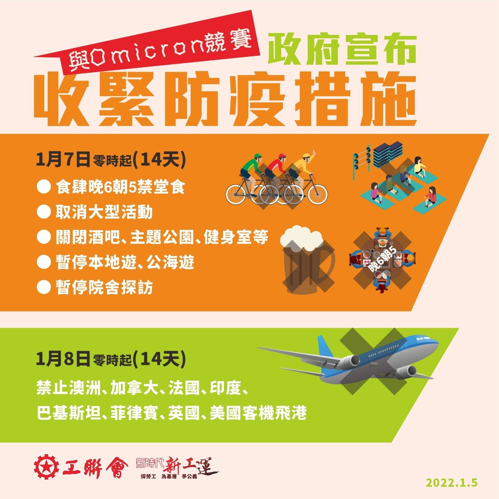 行政長官林鄭月娥今日(1月5日)下午在記者會上形容香港Omicron疫情一觸即發,必須採取「快、準、狠」措施與Omicron競賽,她宣布多項收緊防疫措施,包括1月7日(星期五)凌晨零時起計14天,食肆晚上6時至翌日早上5時全面禁止堂食,B類食肆每枱人數最多2人,C類每枱4人,D類每枱6人。
