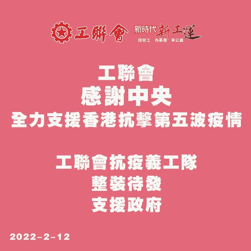 工聯會非常感謝中央政府、廣東省政府及深圳市政府對香港同胞的關愛,接納香港特區政府的多項請求,全力支援香港抗疫。