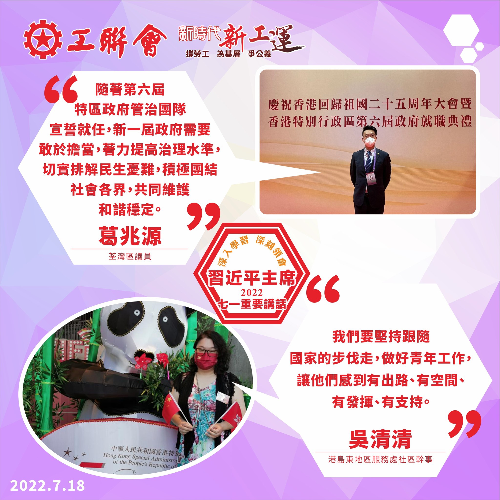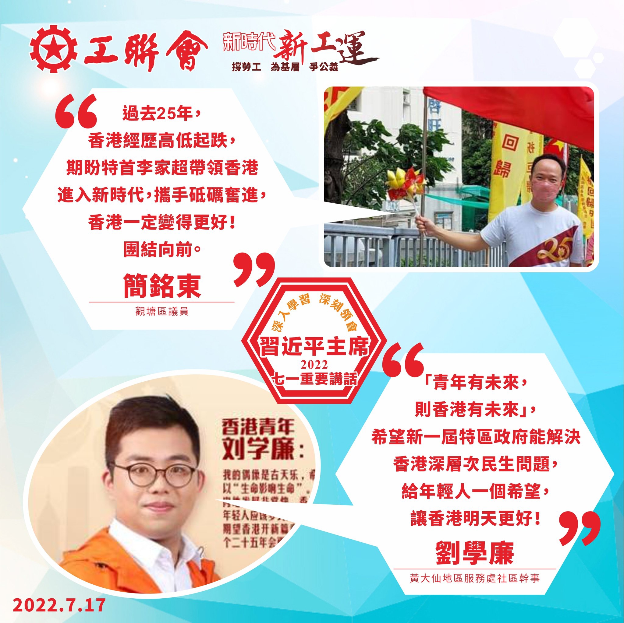 工聯會沙田地區服務處社區幹事古偉冰表示,香港回歸祖國25年,特區政府施政仍有進步的空間,未來需公務員全員問責、目標為本、敢於擔當,加強發展創科,融入國家發展大局,以習主席提到「民有所呼,我有所應」為核心價值觀。同時要真心擁護一國兩制方針,讓香港創造更大輝煌。 區議員葛兆源︰團結社會各界 共同維護和諧穩定 社區幹事吳清清︰堅持跟隨國家的步伐走 區議員簡銘東︰特首帶領香港攜手砥礪奮進 社區幹事劉學廉︰給年輕人一個希望 工聯會觀塘區議員簡銘東說,過去25年,香港經歷高低起跌,現在「由亂到治,由治及興」,期盼特首李家超帶領香港進入新時代,攜手砥礪奮進,香港一定變得更好!