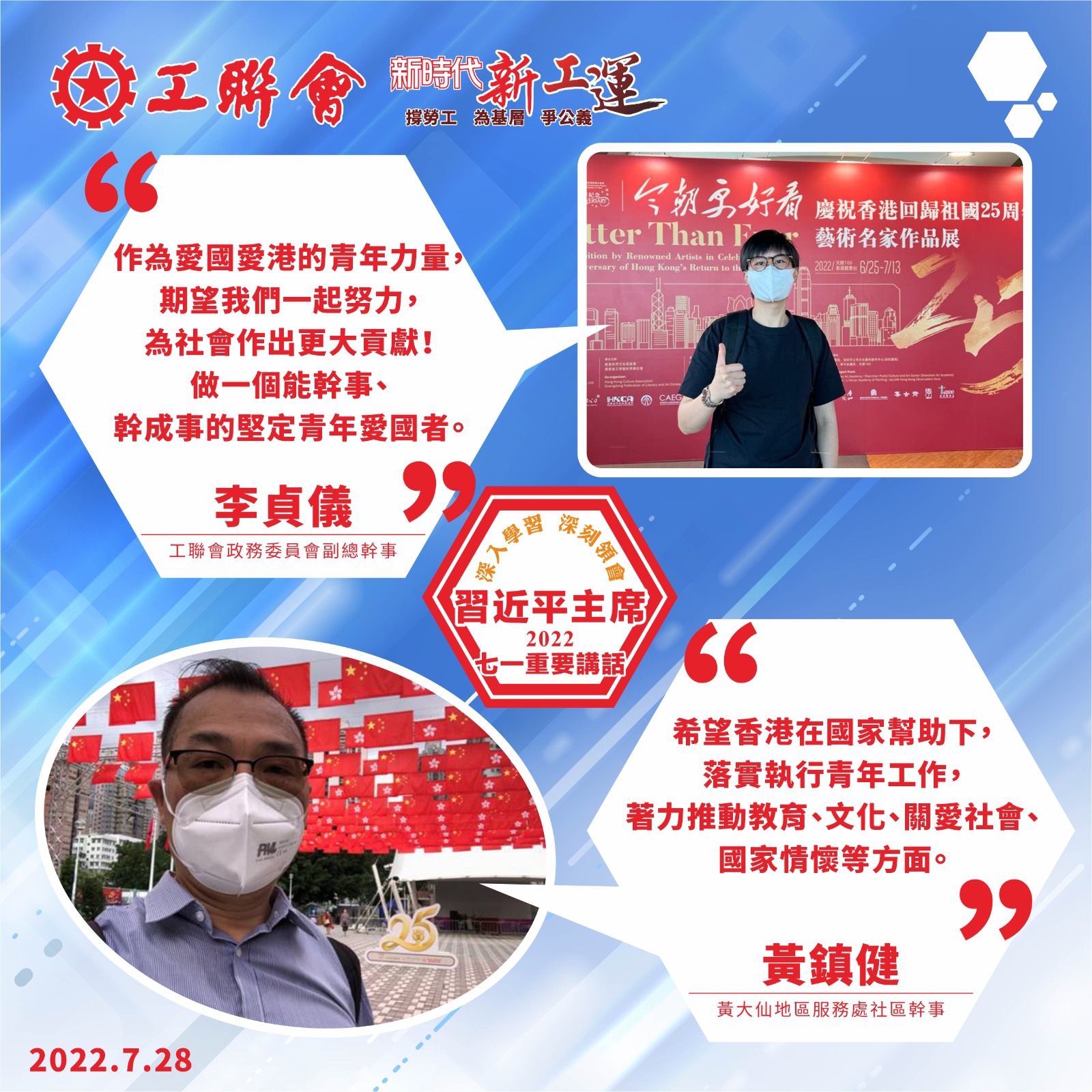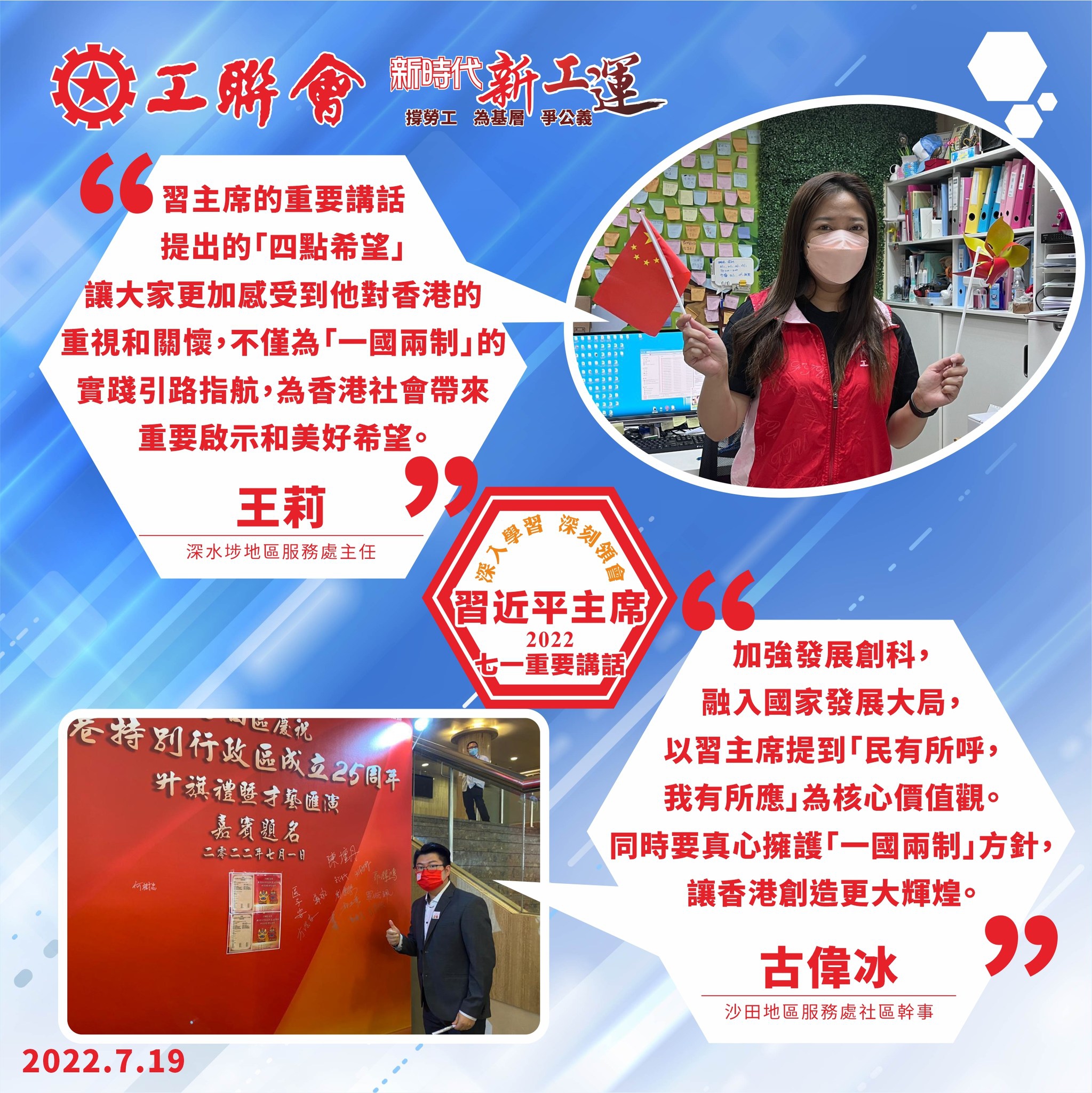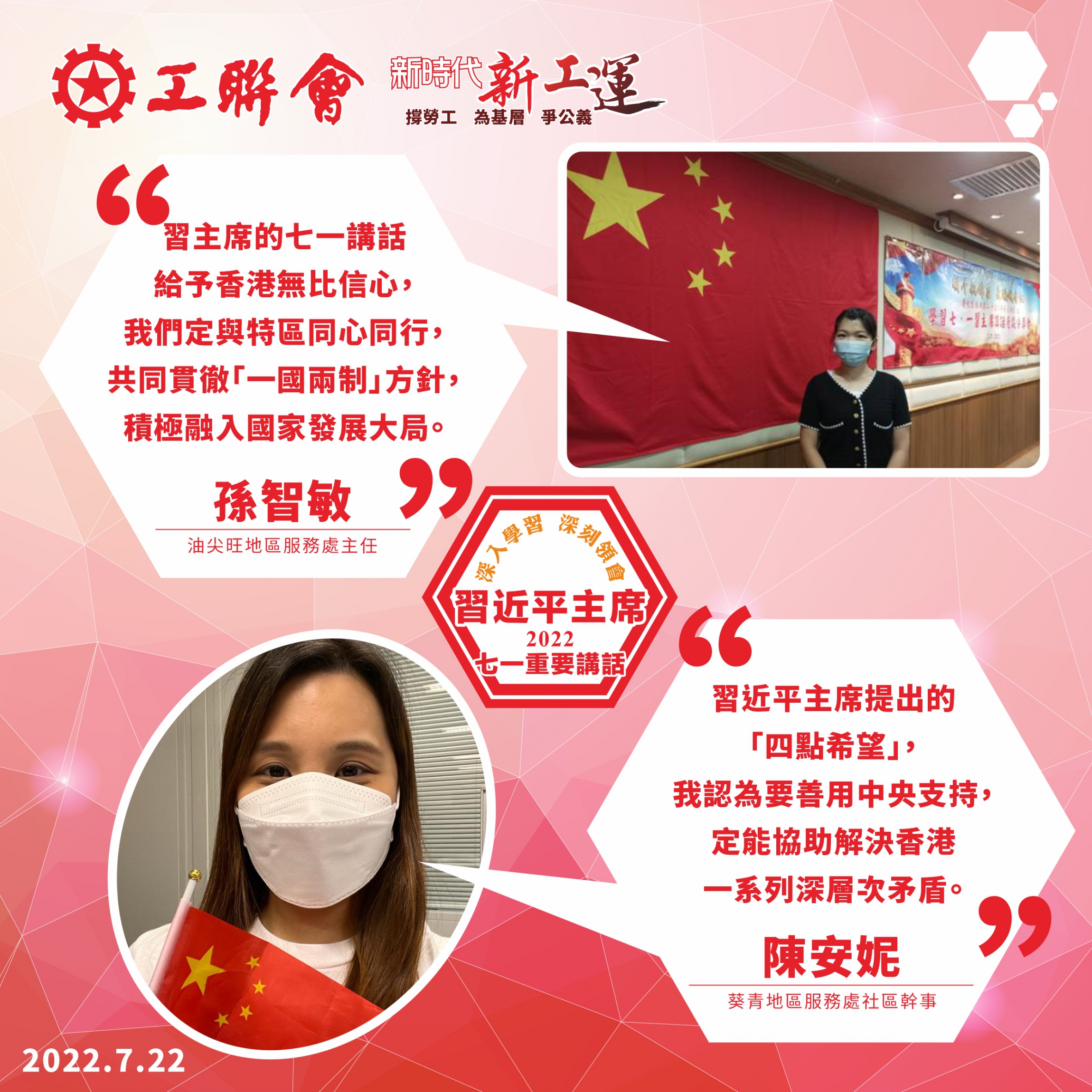 工聯會油尖旺地區服務處主任孫智敏表示,習主席的七一講話給予香港無比信心,港人定與特區同心同行,共同貫徹「一國兩制」方針,建設和發展好經濟、民生和青年隊伍等方面,積極融入國家發展大局中。