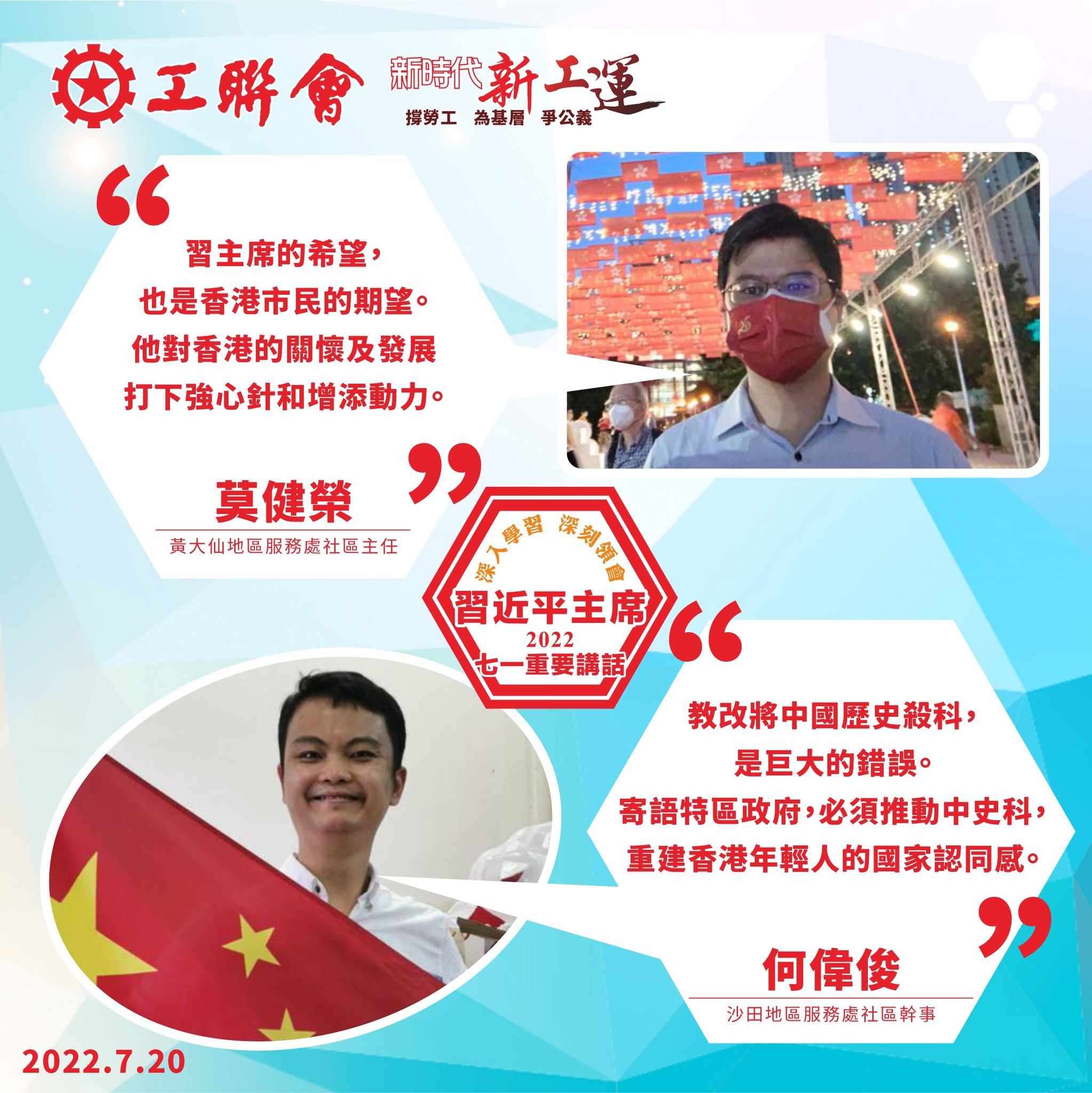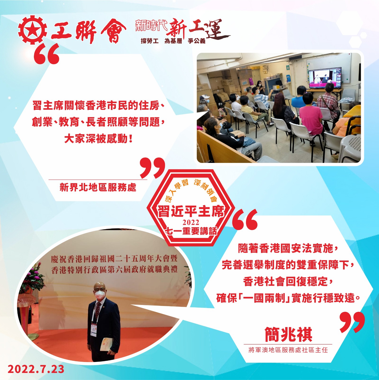 工聯會將軍澳地區服務處社區主任簡兆祺表示,他對習主席提到的「香港正處在從由亂到治走向由治及興的新階段」這句說話特別感慨。因為經歷了「黑暴」,令香港社會受到嚴重的衝擊,隨著香港國安法實施,完善選舉制度的雙重保障下,香港社會回復穩定,確保「一國兩制」實施行穩致遠。他祝願祖國繁榮昌盛,香港再創輝煌! 地區服務處主任孫智敏:習主席講話給予香港無比信心 社區幹事陳安妮:協助解決香港一系列深層次矛盾