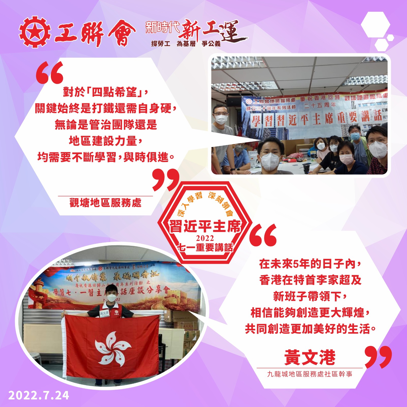 港島東地區服務處︰堅持中央全面管治權和保障特區高度自治權相統一 社區幹事彭俊發︰抓緊機遇努力拼搏 工聯會港島東地區服務處表示,香港特區回歸25年,必須堅持中央全面管治權和保障特別行政區高度自治權相統一;民生方面,要解決住房、教育、養老、就業四大深層次矛盾,改善民生。 工聯會觀塘地區服務處社區幹事彭俊發表示,習主席的講話為香港未來發展帶來一個新方向,我們更應該抓緊機遇,努力拼搏,為香港創造輝煌貢獻上自己微薄之力,實現中華民族的偉大復興略盡綿力。 觀塘地區服務處︰不斷學習與時俱進 社區幹事黃文港︰相信香港能創造更大輝煌 新界北地區服務處:習主席關懷香港市民深被感動 社區主任簡兆祺:香港國安法和完善選舉制度讓社會回復穩定