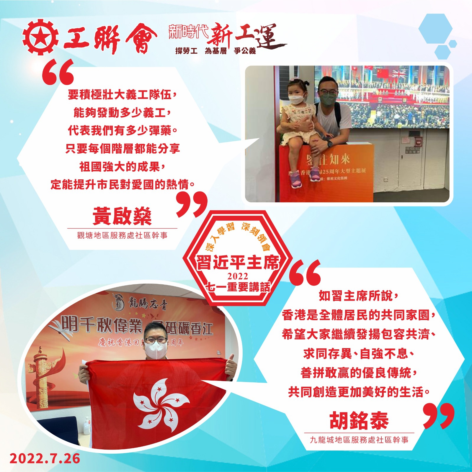 社區幹事黃啟燊:積極壯大義工隊伍 提升市民愛國熱情 社區幹事胡銘泰:弘揚愛國愛港 發揚包容共濟傳統 工聯會觀塘地區服務處社區幹事黃啟燊表示,要積極壯大義工隊伍,能夠發動多少義工,代表我們有多少彈藥。只要每個階層都能分享祖國強大的成果,定能提升市民對愛國的熱情。 工聯會九龍城地區服務處社區幹事胡銘泰表示,如習主席所說,香港是全體居民的共同家園,希望全體香港同胞大力弘揚以愛國愛港為核心、同「一國兩制」方針相適應的主流價值觀,繼續發揚包容共濟、求同存異、自強不息、善拼敢贏的優良傳統,共同創造更加美好的生活。