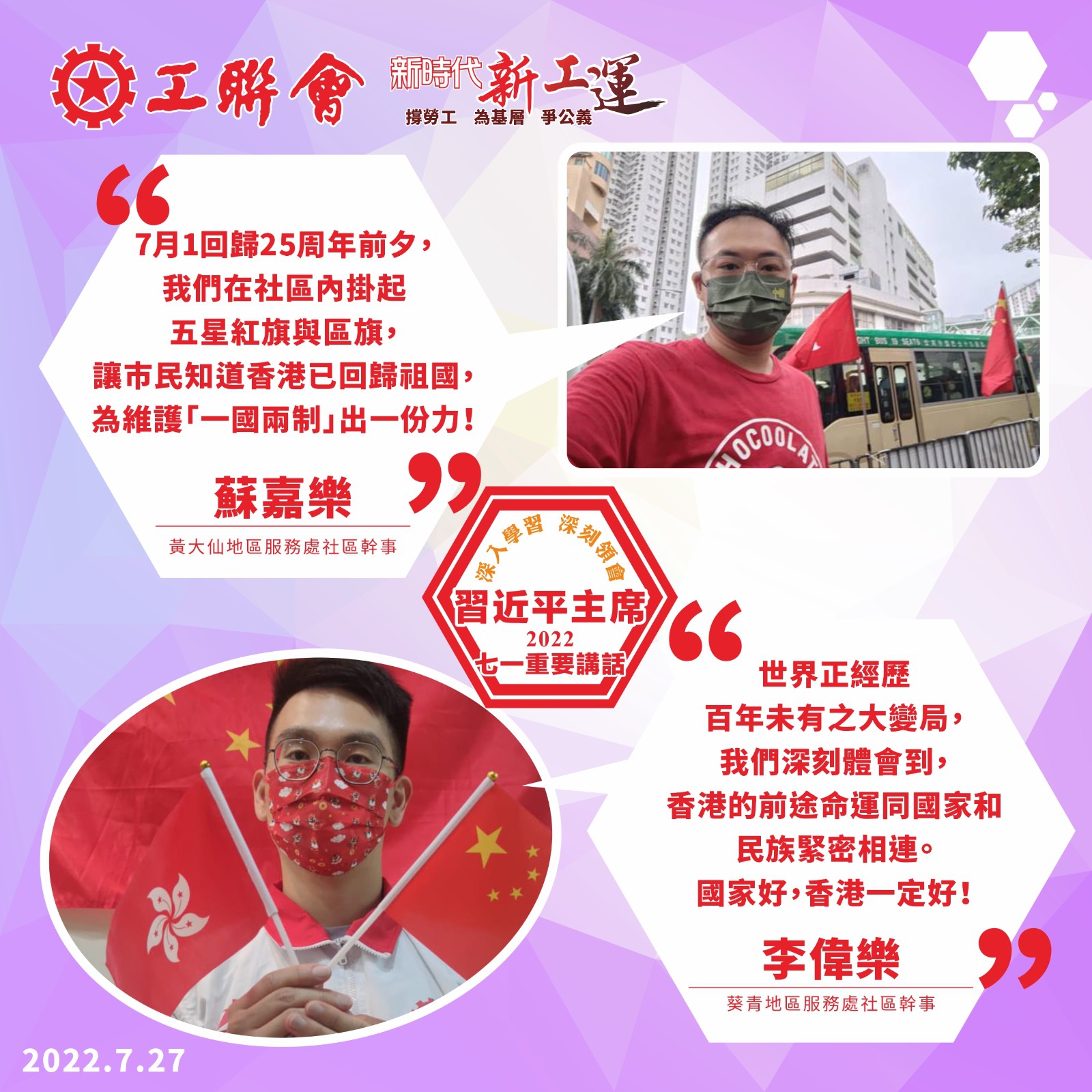社區幹事蘇嘉樂:為維護「一國兩制」出一份力 社區幹事李偉樂:國家好,香港一定好 工聯會黃大仙地區服務處社區幹事蘇嘉樂表示,香港回歸祖國25周年,作為社區的「模範先鋒」,他與拍檔一起在社區內掛起五星紅旗與區旗,讓市民知道香港已回歸祖國,維護「一國兩制」出一份力! 工聯會葵青地區服務處社區幹事李偉樂表示,世界正經歷百年未有之大變局,深刻體會到香港的前途命運與國家和民族緊密相連。國家好,香港一定好!