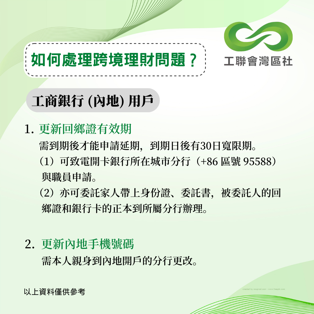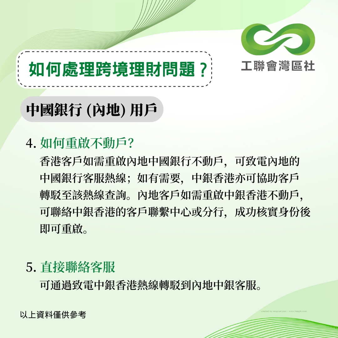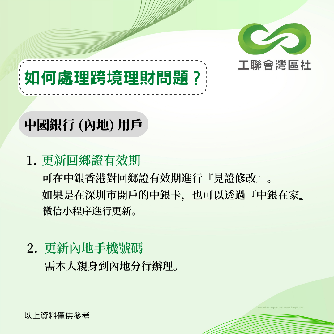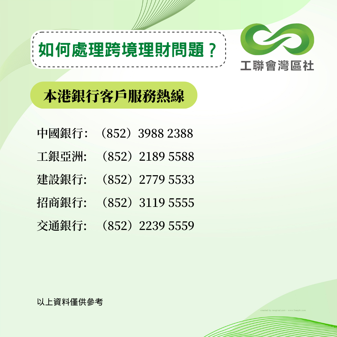 疫情下內地和香港一直未能通關,不少港人面對跨境理財的難題未能解決。今年5月,中銀香港曾公佈跨境銀行服務優化安排,協助港人以遙距方式更新資料。香港工聯會大灣區服務社持續跟進其他銀行的跨境服務安排,得悉以下數間銀行針對港澳人士之內地銀行賬戶的最新跨境服務安排。以下資料僅供參考,詳情建議致電本港及內地銀行查詢。 __________________________________________________ 更多大灣區資訊:www.ftugba.org.hk 香港工聯會大灣區服務社諮詢熱線:(852) 2701 2808
