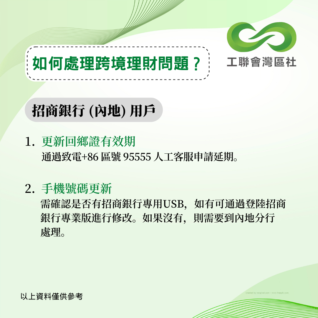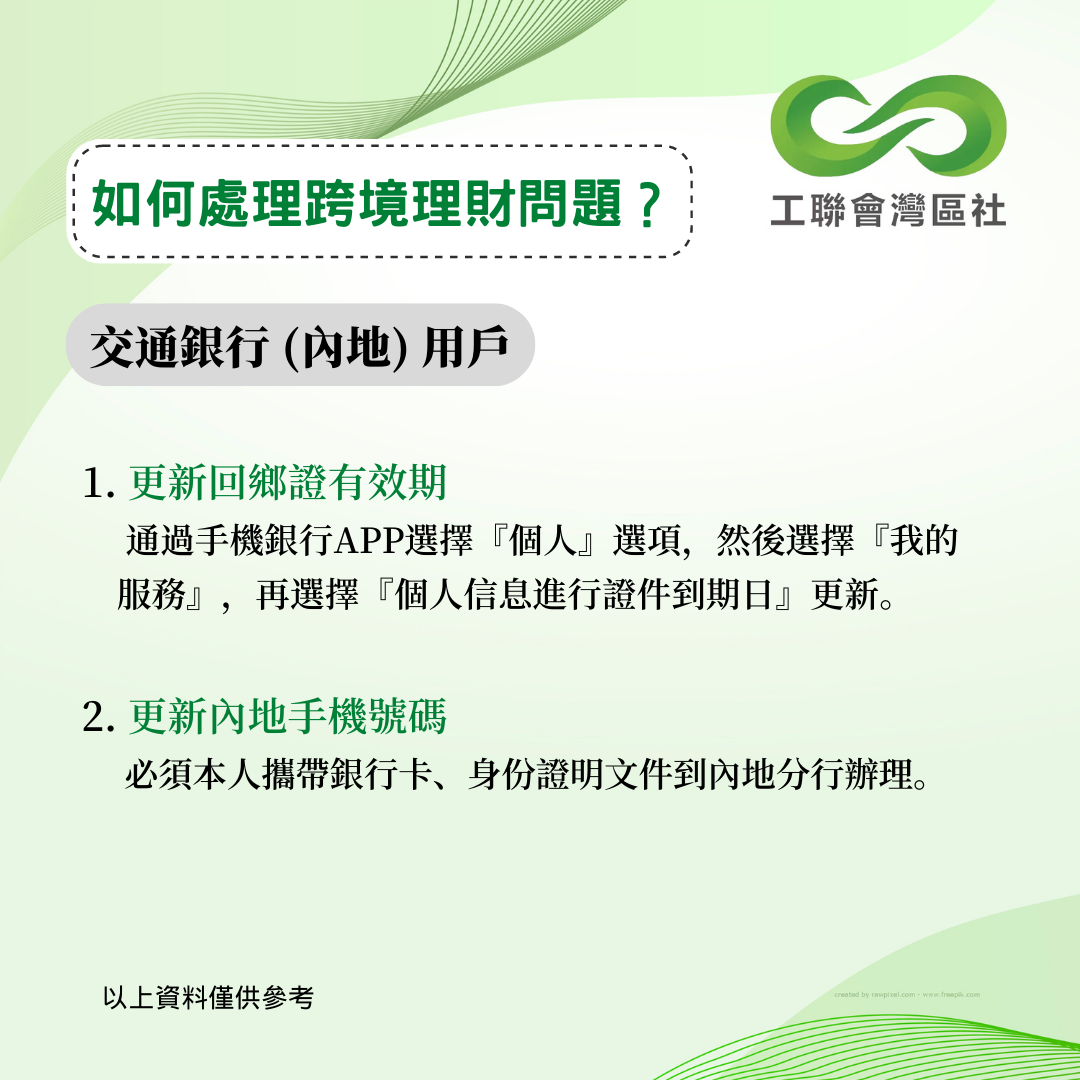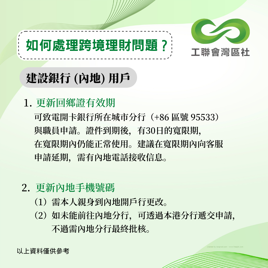 疫情下內地和香港一直未能通關,不少港人面對跨境理財的難題未能解決。今年5月,中銀香港曾公佈跨境銀行服務優化安排,協助港人以遙距方式更新資料。香港工聯會大灣區服務社持續跟進其他銀行的跨境服務安排,得悉以下數間銀行針對港澳人士之內地銀行賬戶的最新跨境服務安排。以下資料僅供參考,詳情建議致電本港及內地銀行查詢。 __________________________________________________ 更多大灣區資訊:www.ftugba.org.hk 香港工聯會大灣區服務社諮詢熱線:(852) 2701 2808