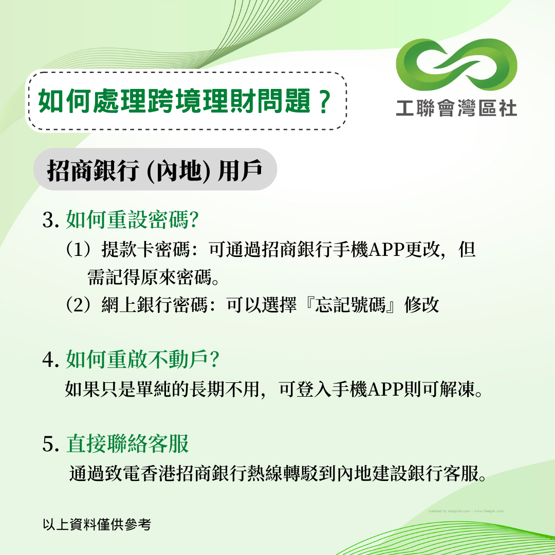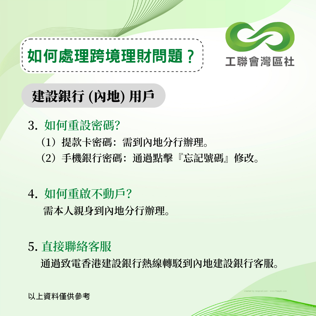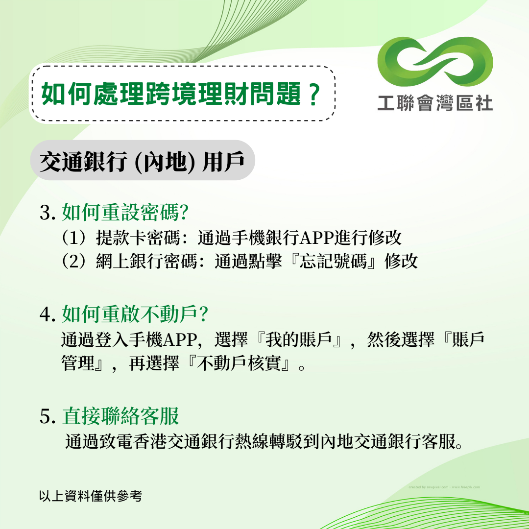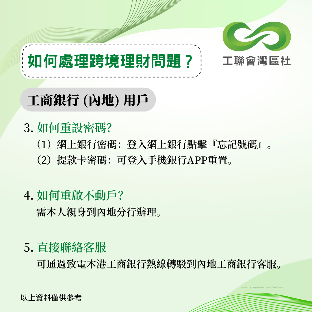 疫情下內地和香港一直未能通關,不少港人面對跨境理財的難題未能解決。今年5月,中銀香港曾公佈跨境銀行服務優化安排,協助港人以遙距方式更新資料。香港工聯會大灣區服務社持續跟進其他銀行的跨境服務安排,得悉以下數間銀行針對港澳人士之內地銀行賬戶的最新跨境服務安排。以下資料僅供參考,詳情建議致電本港及內地銀行查詢。 __________________________________________________ 更多大灣區資訊:www.ftugba.org.hk 香港工聯會大灣區服務社諮詢熱線:(852) 2701 2808