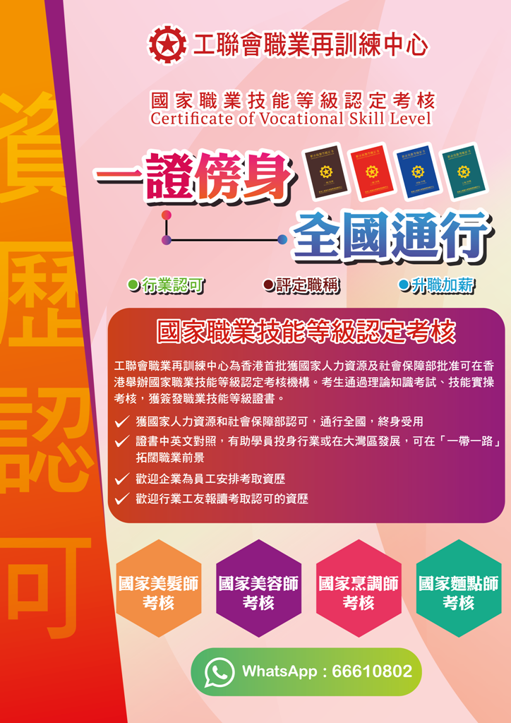 工聯會職業再訓練中心為香港首批獲國家人力資源及社會保障部批准可在香港舉辦國家職業技能等級認定考核機構。考生通過理論知識考試、技能實操考核,獲簽發職業技能等級證書。 考核行業包括:美髮、美容、中式烹調、中式麵點 簡單報名及查詢:>>請按此 Whatsapp查詢:6661 0802 詳情請參閱網站:https://www.hkftustsc.org/nvs/