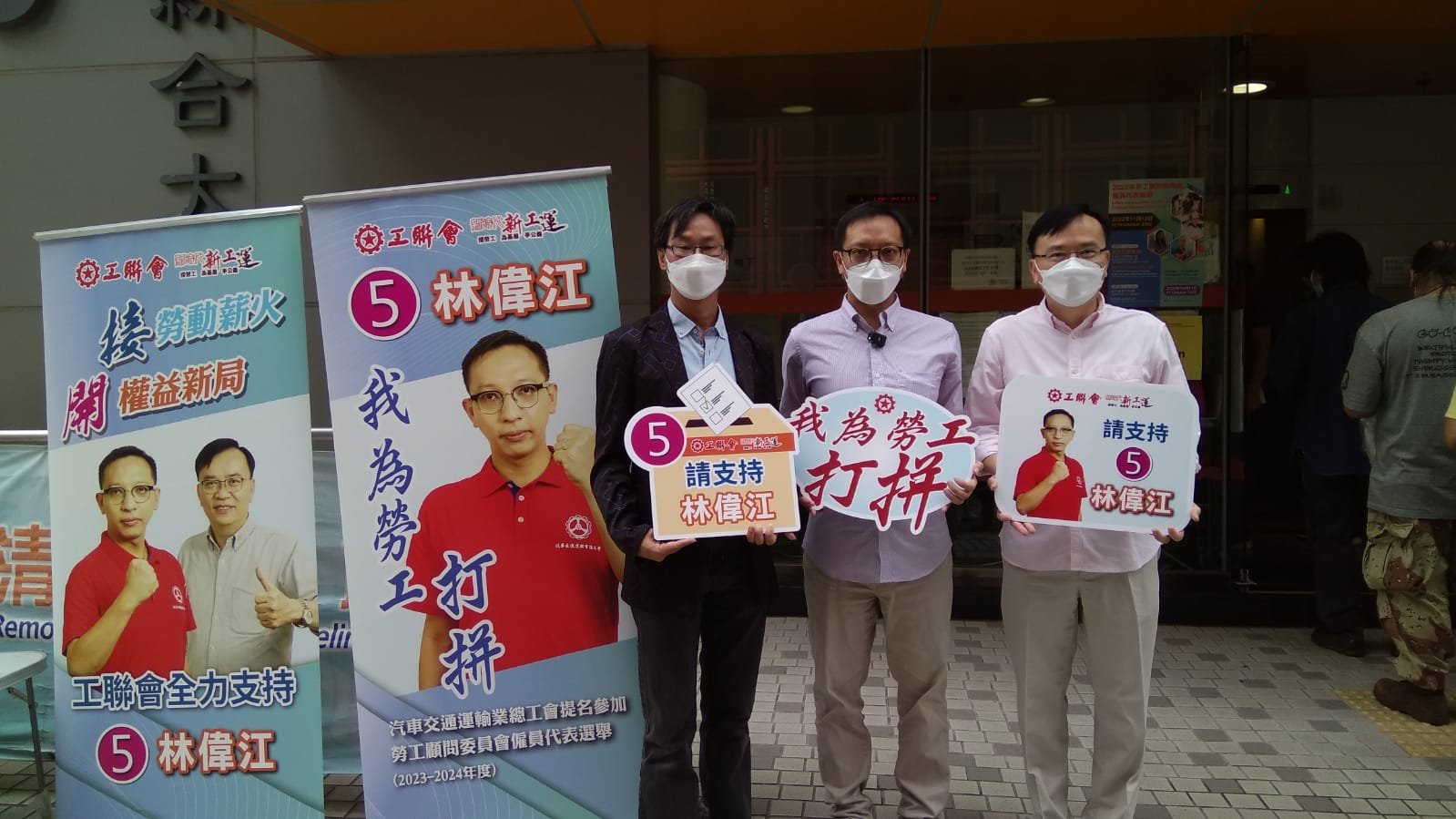 勞工顧問委員會(2023-2024年度)僱員代表選舉今日(11月12日)舉行,獲得香港工會聯合會(工聯會)推薦及汽車交通運輸業總工會(汽車總工會)提名參選的林偉江,在工聯會理事長黃國,汽車總工會主席陳兆華以及工會負責人陪同下一早到場拉票,他們用行動支持林偉江參選更好為勞工服務。