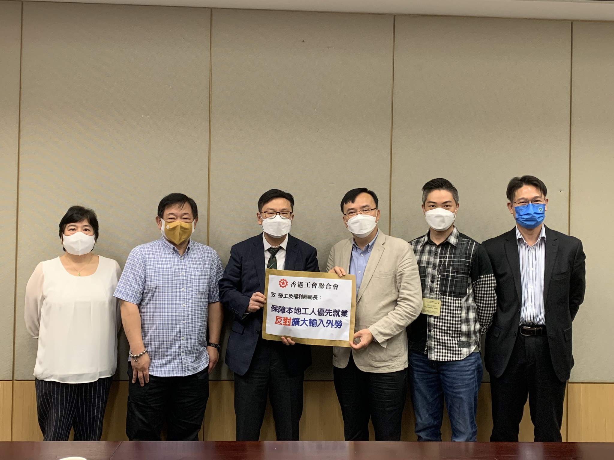 勞工及福利局局長早前透露計劃將在明年第一季推出「特別計劃」容許輸入院舍護理員,並擴大輸入外勞至所有院舍,大量外勞進入院舍工作已迫在眉睫。故今日(11月29日)工聯會理事長黃國、工聯會職業訓練及促進就業委員會主任陳鄧源、工聯會權益委員會主任丘燿誠、工聯會職業訓練及促進就業委員會副主任及立法會議員梁子穎,以及醫院診所護理業職工會理事長潘惠賢與局長孫玉菡會面,表達不滿和憂慮,且對政府提出多項建議,要求保障本地工人優先就業。