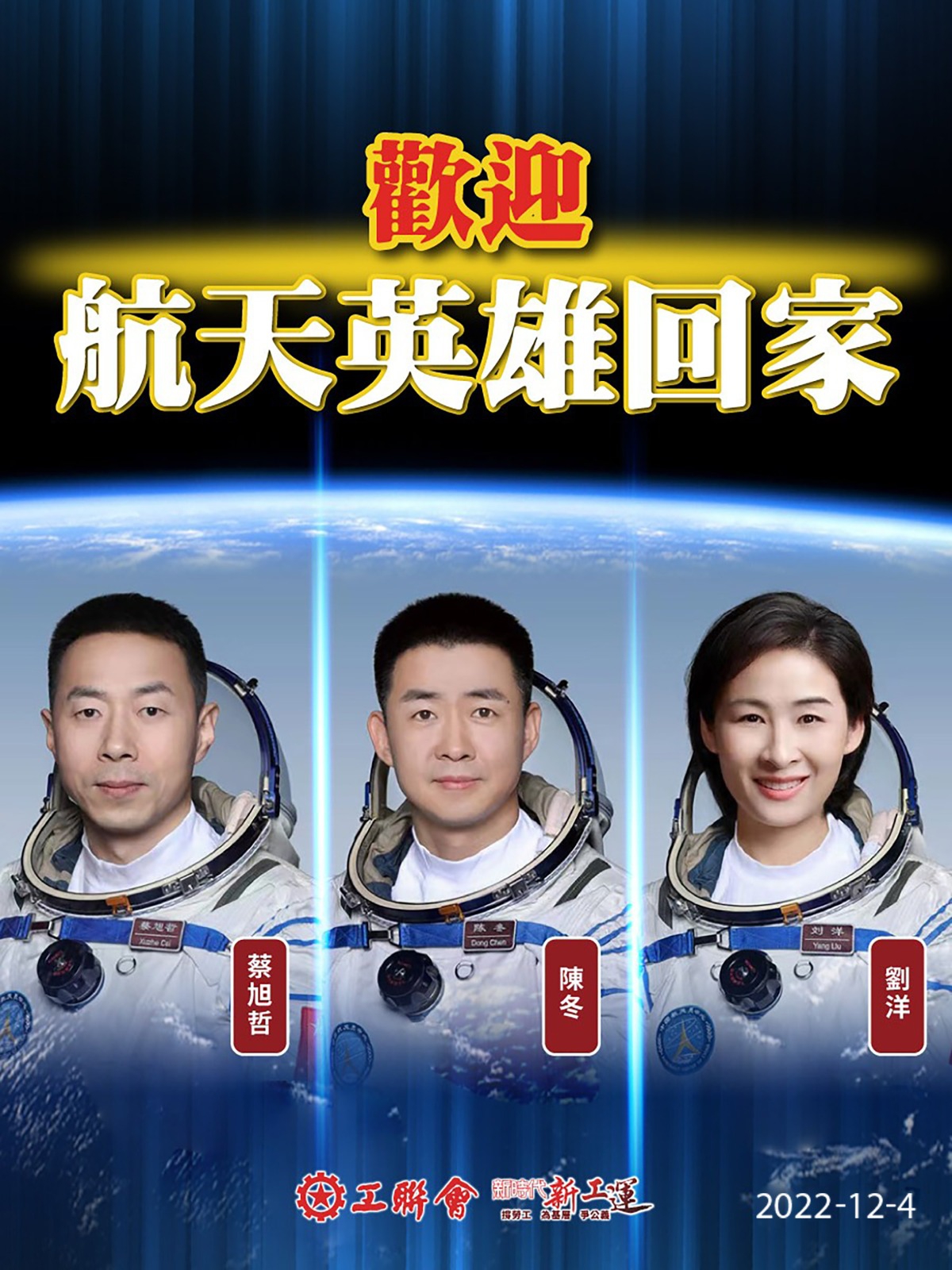 搭載陳冬、劉洋和蔡旭哲三名航天員的神舟十四號載人飛船,今年6月5日升空,3人已在太空逗留了6個月。