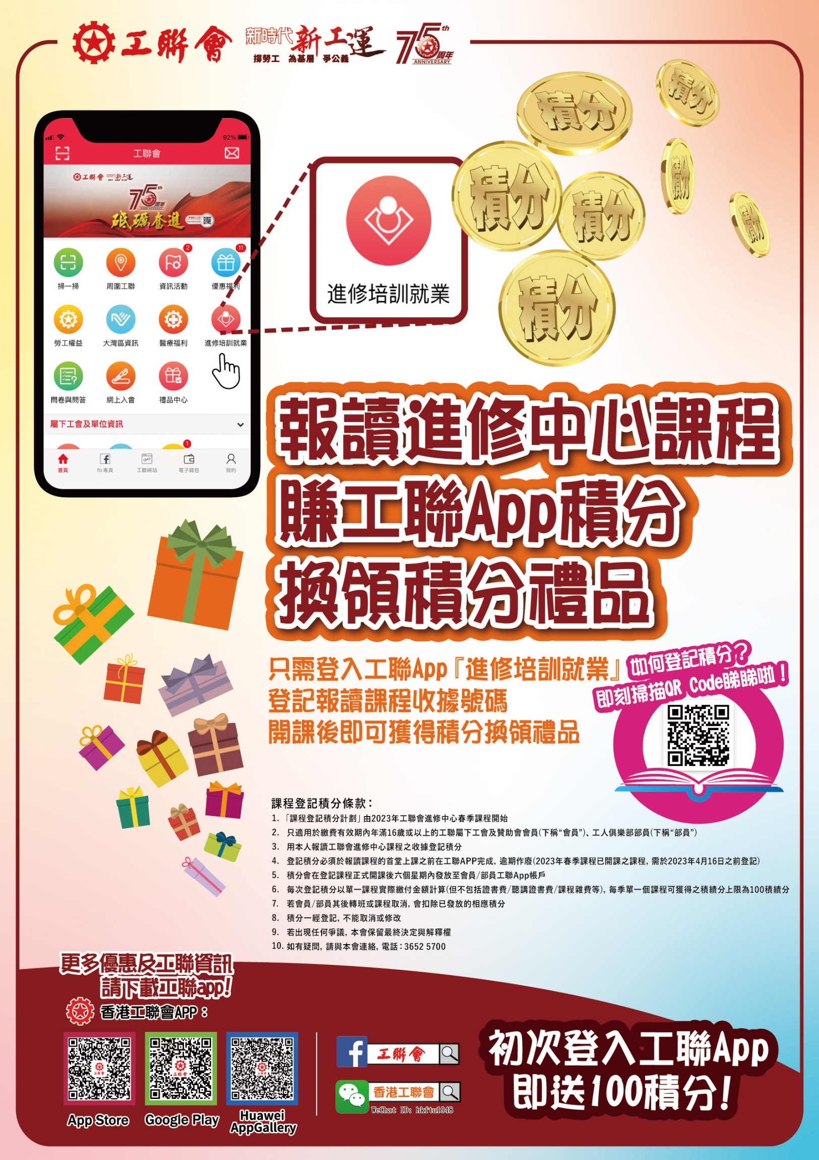 由2023年春季課程開始,工聯會屬下工會及贊助會會員、工人俱樂部部員報讀進修中心課程,即可以在工聯App中登記賺取積分,換領禮品!