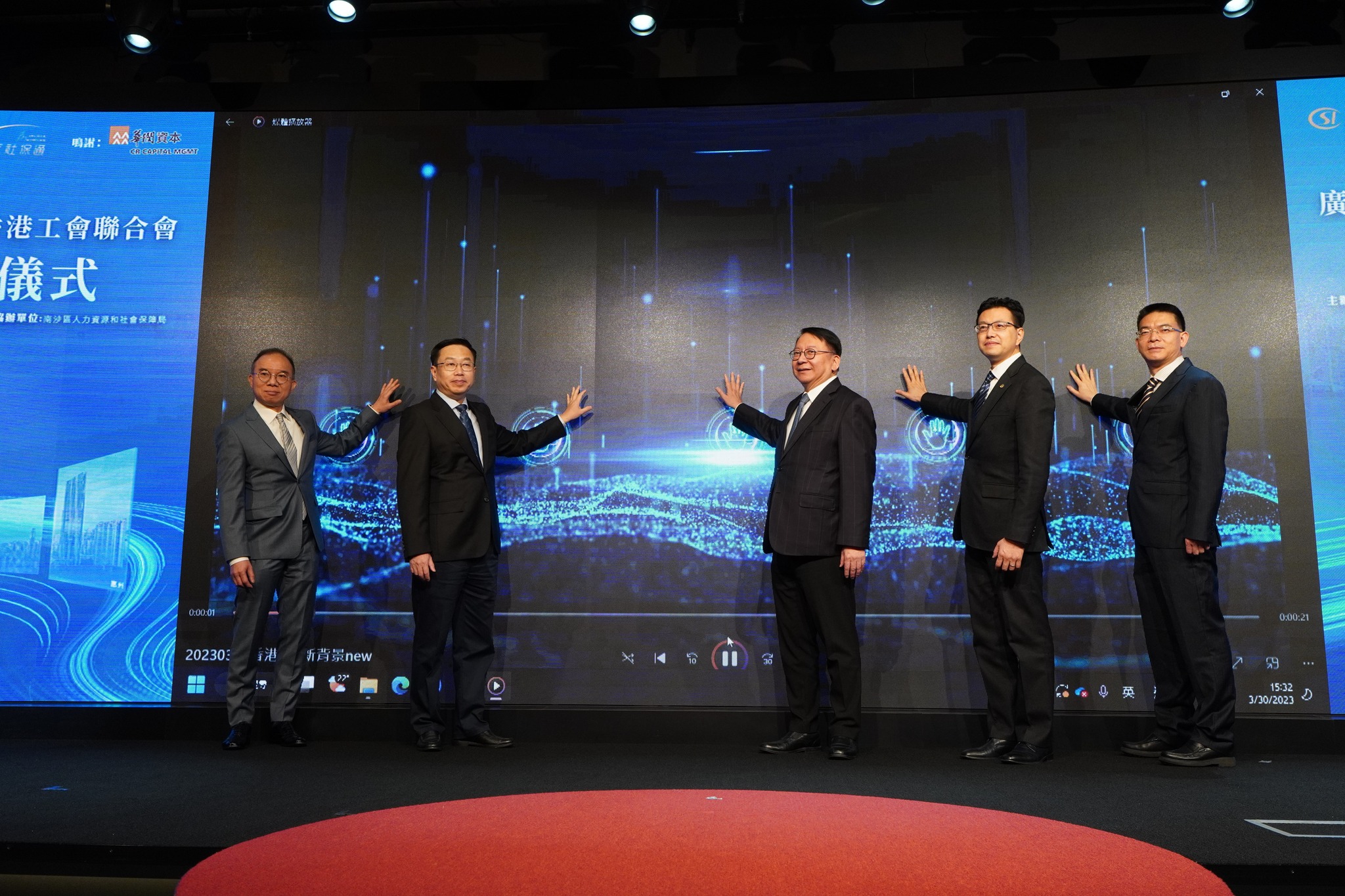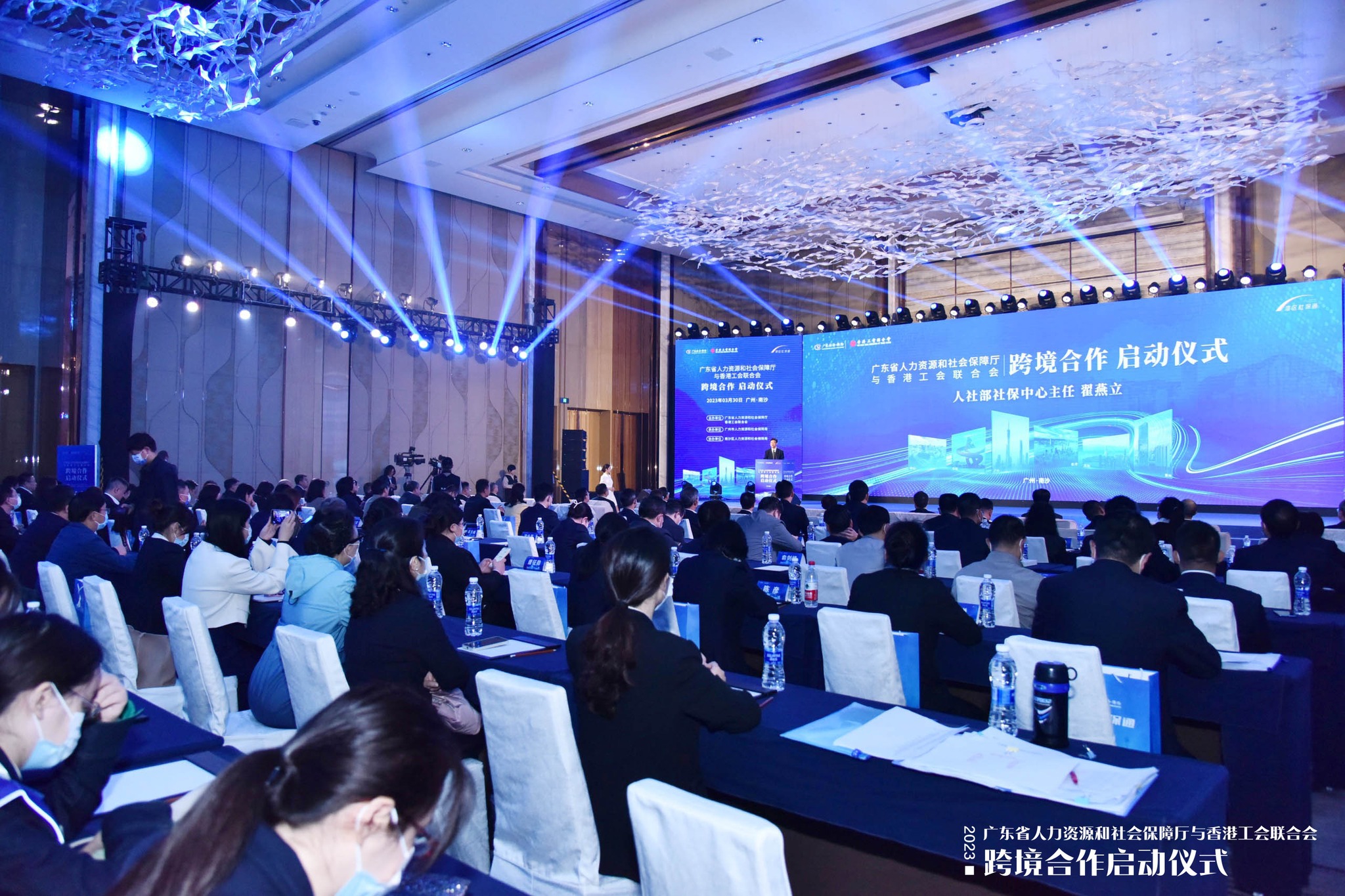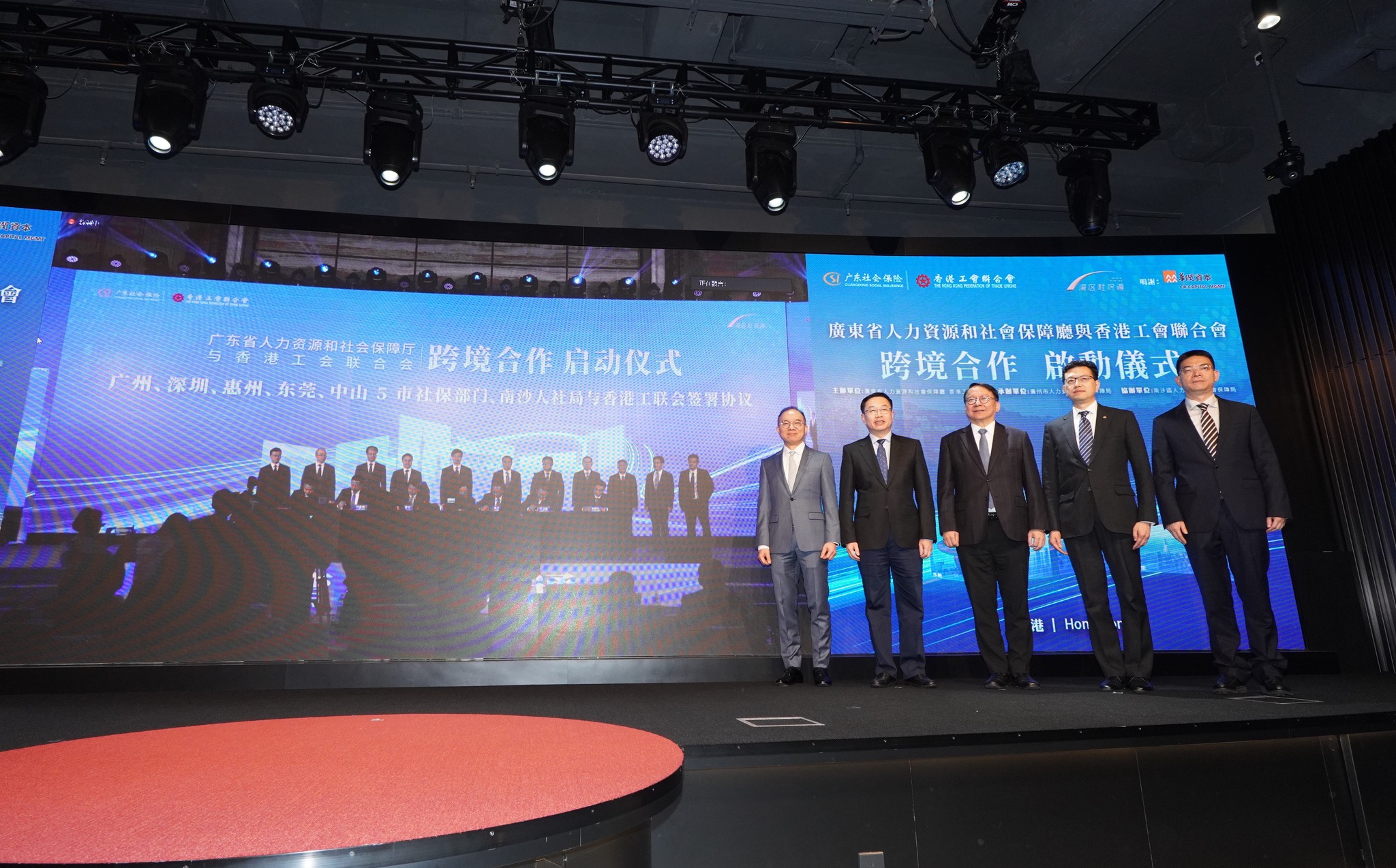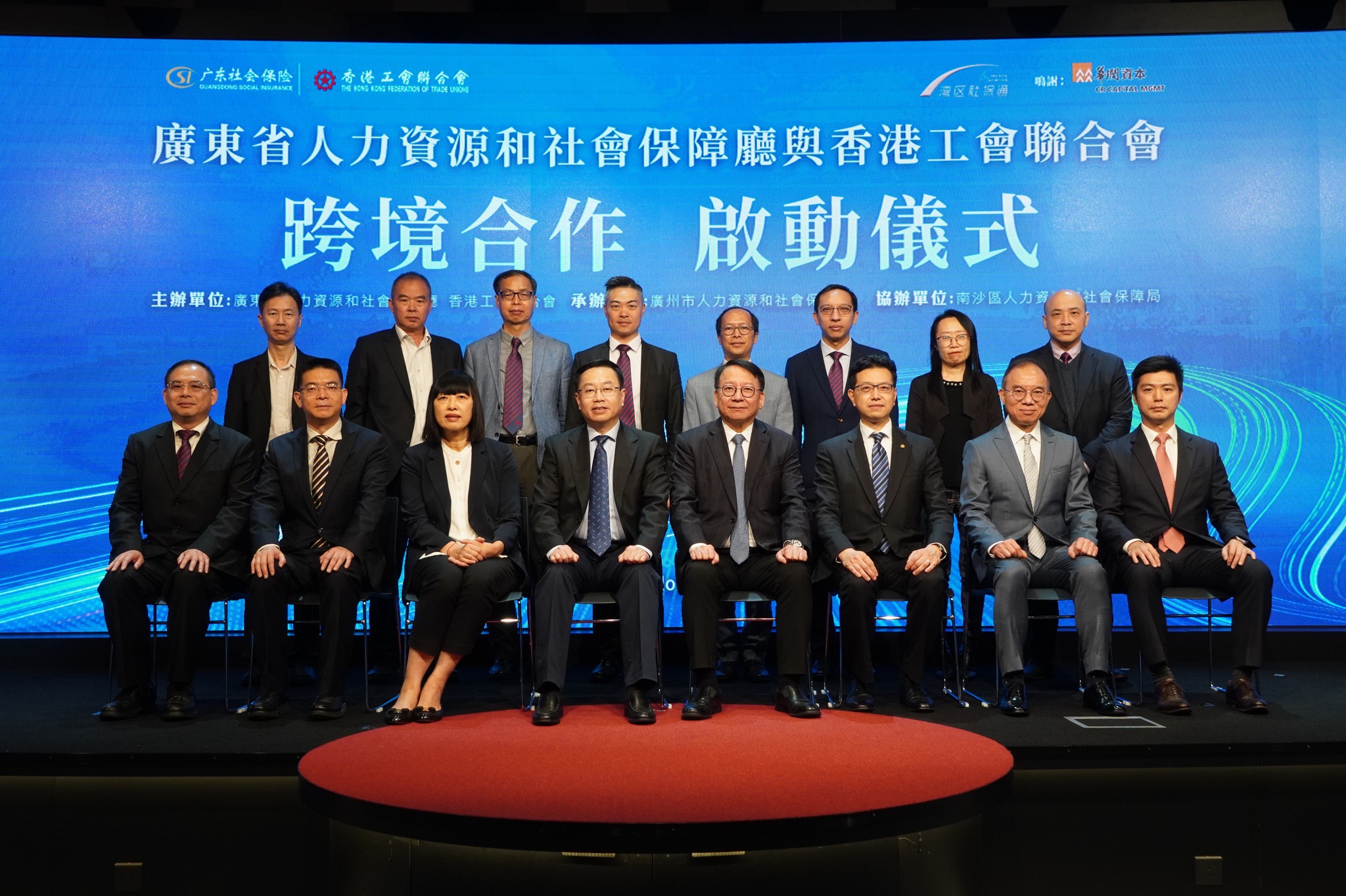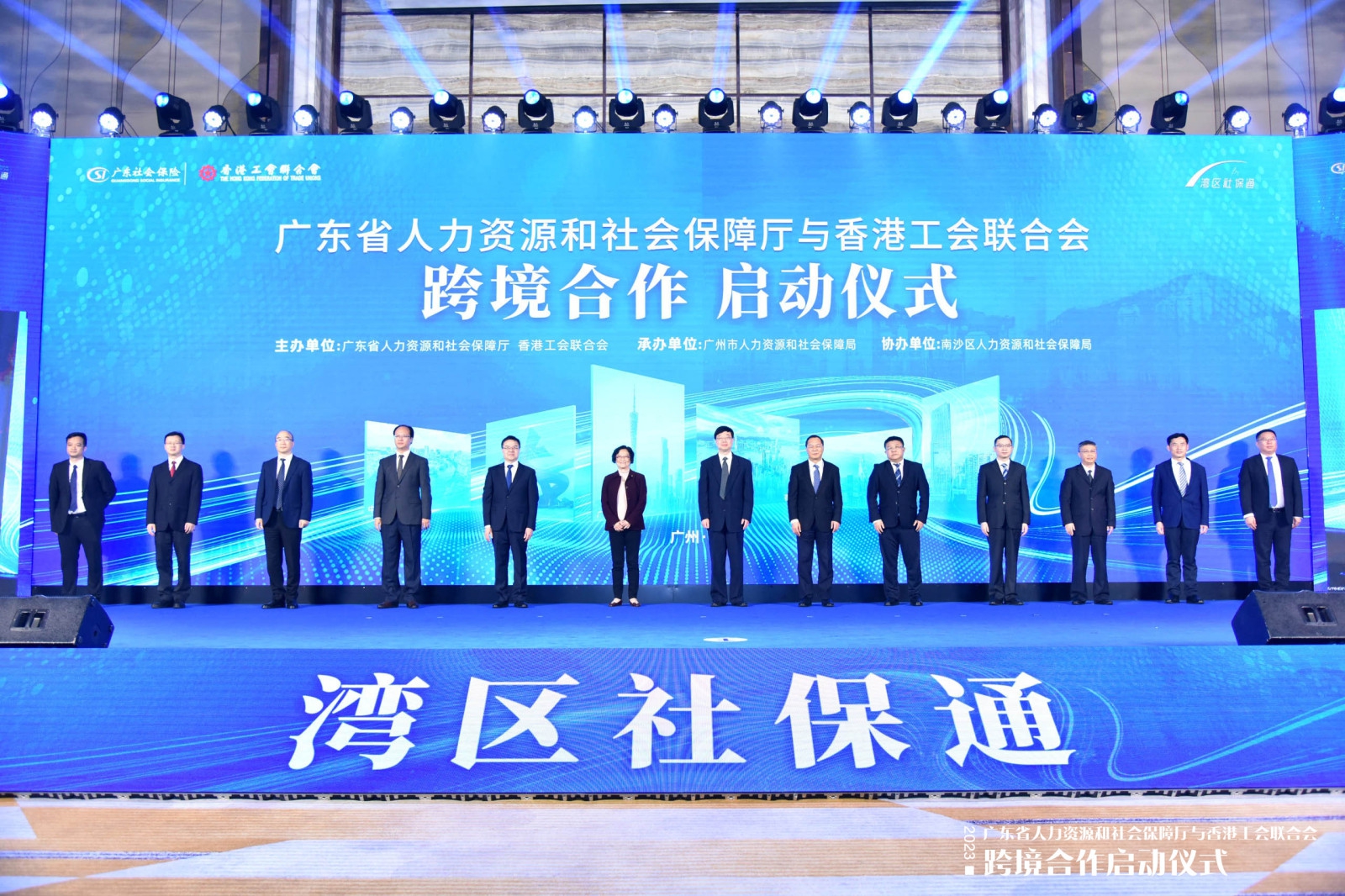 國家人社部社保中心主任翟燕立,廣州市委常委、南沙區委書記盧一先,廣東省人社廳黨組成員、省社保局黨委書記夏青,香港特區政府署理行政長官陳國基,工聯會會長吳秋北分別發表致辭。