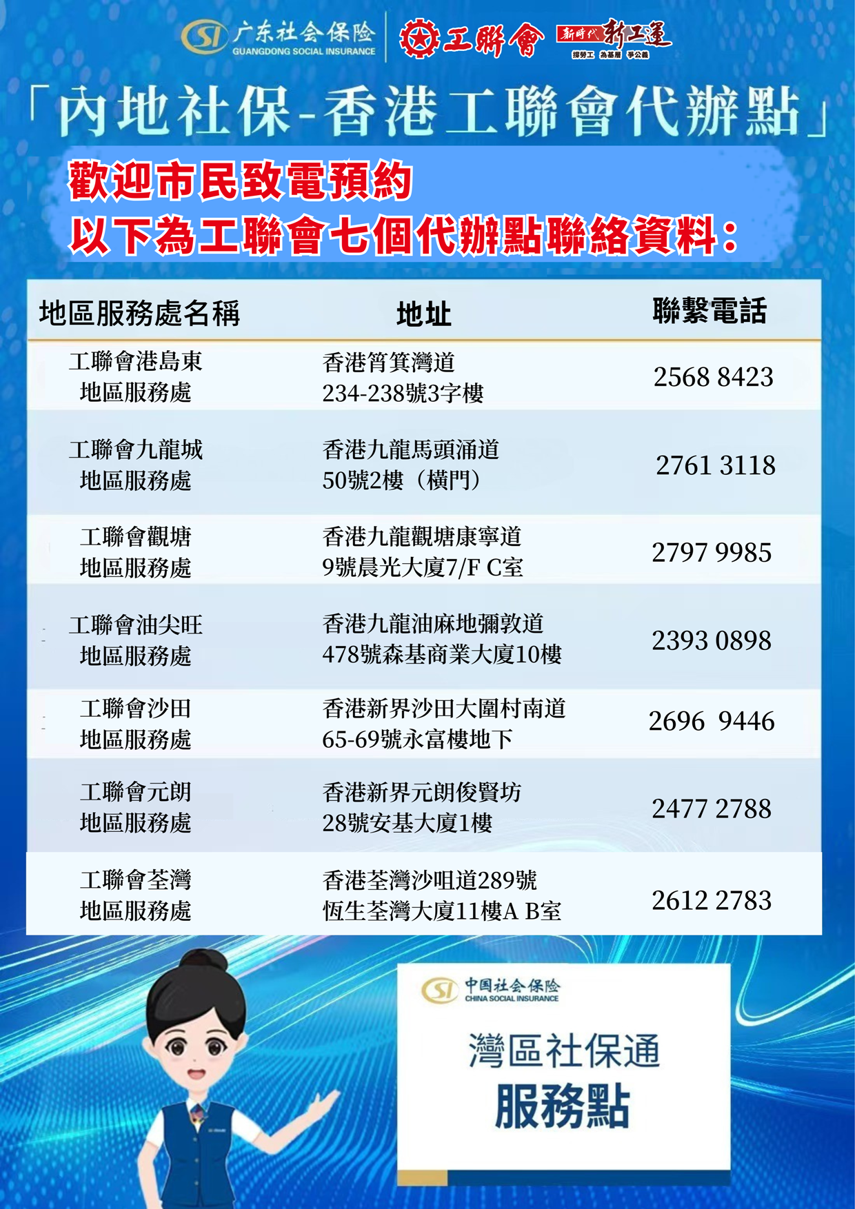 工聯會內地諮詢服務中心長期以來全力支援內地港人服務,這次獲得大灣區內地城市社會保險基金保障局在香港指定服務網點,也是全港首個服務單位在港提供此項服務。首階段會在工聯會7個地區辦事處提供服務,為有需要的港人提供指導,包括如何使用廣東政務服務網、粵省事「灣區社保通」專區等線上社保服務功能等業務,期望讓更多香港市民認識內地社保計劃,同時也方便港人購買社保。