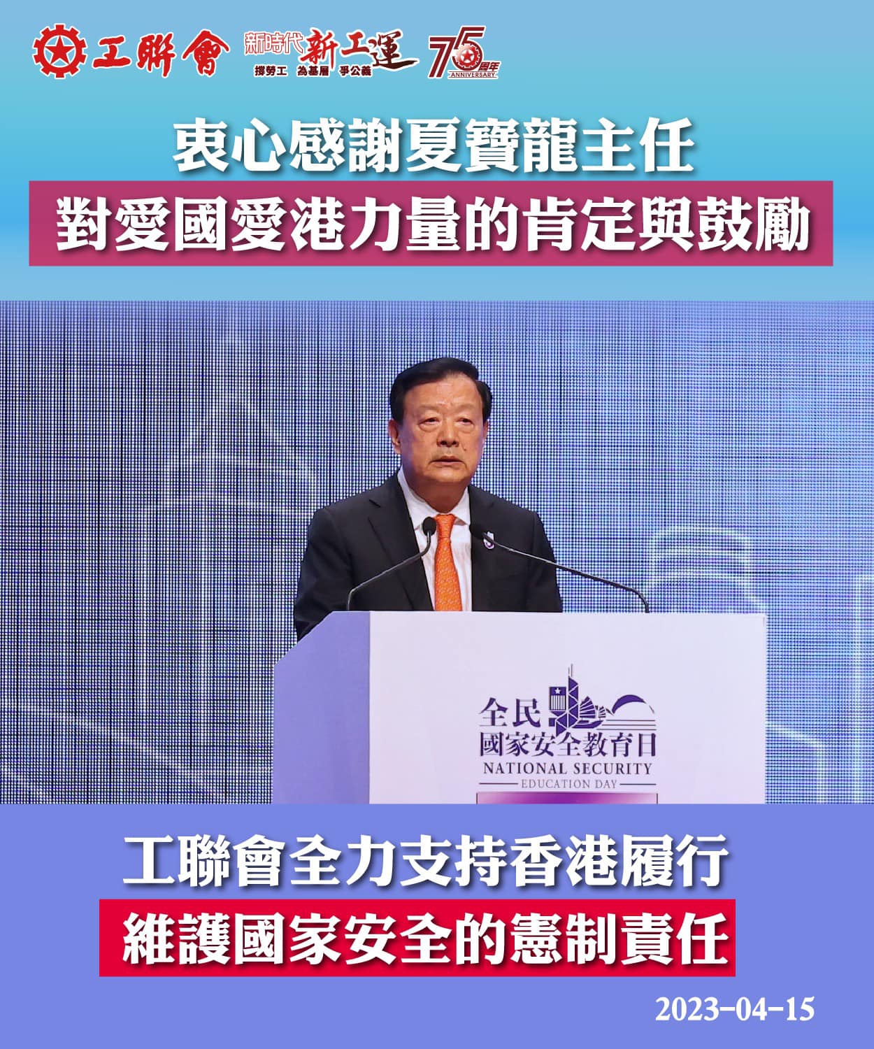 2023-04-15 衷心感謝夏寶龍主任對愛國愛港力量的肯定與鼓勵 工聯會全力支持香港履行維護國家安全的憲制責任