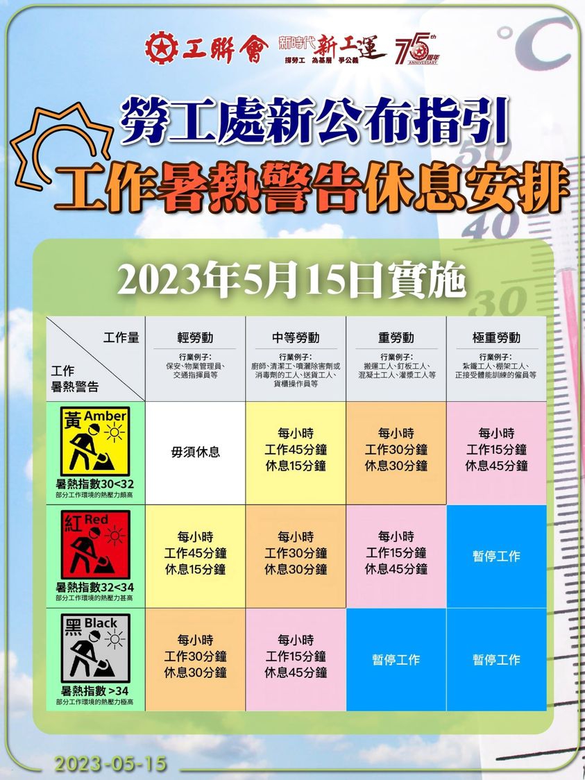 2023-05-18 【黃色工作暑熱警告首次生效:下午1時50分】紮鐵、棚架工人應每工作15分鐘休息45分鐘 職安健:工友記得採取適當的拱施以免中暑
